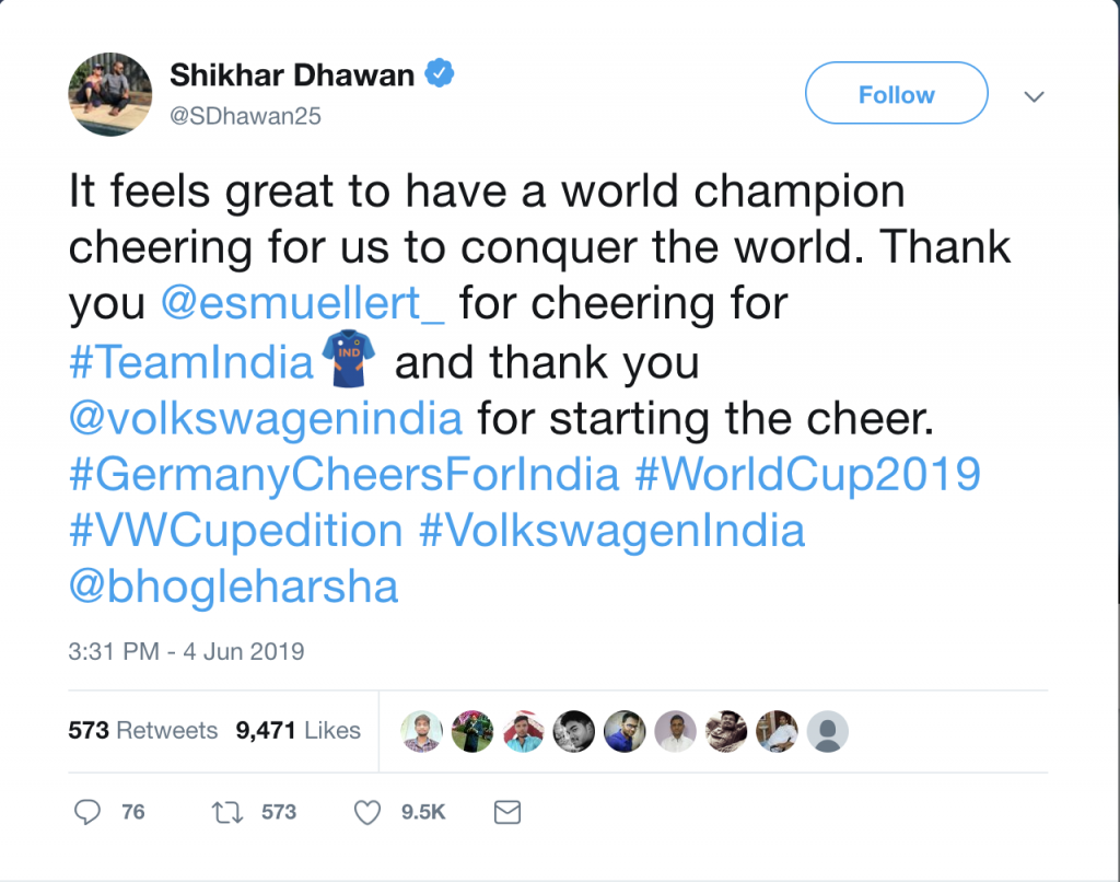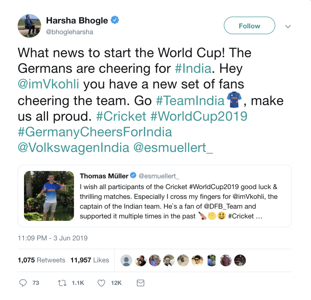 As Team India was getting ready to play its first match against South Africa on June 5th, Volkswagen India was uniting the German and Indian fans for cheering Team India. Muller’s tweet engaged more influencers from Germany and India. Even the Indo-German Commerce Council and German Consul-Mumbai joined the movement, posting their photos in blue jerseys on social media.