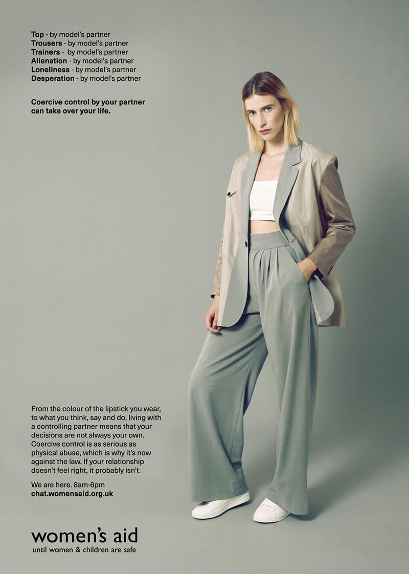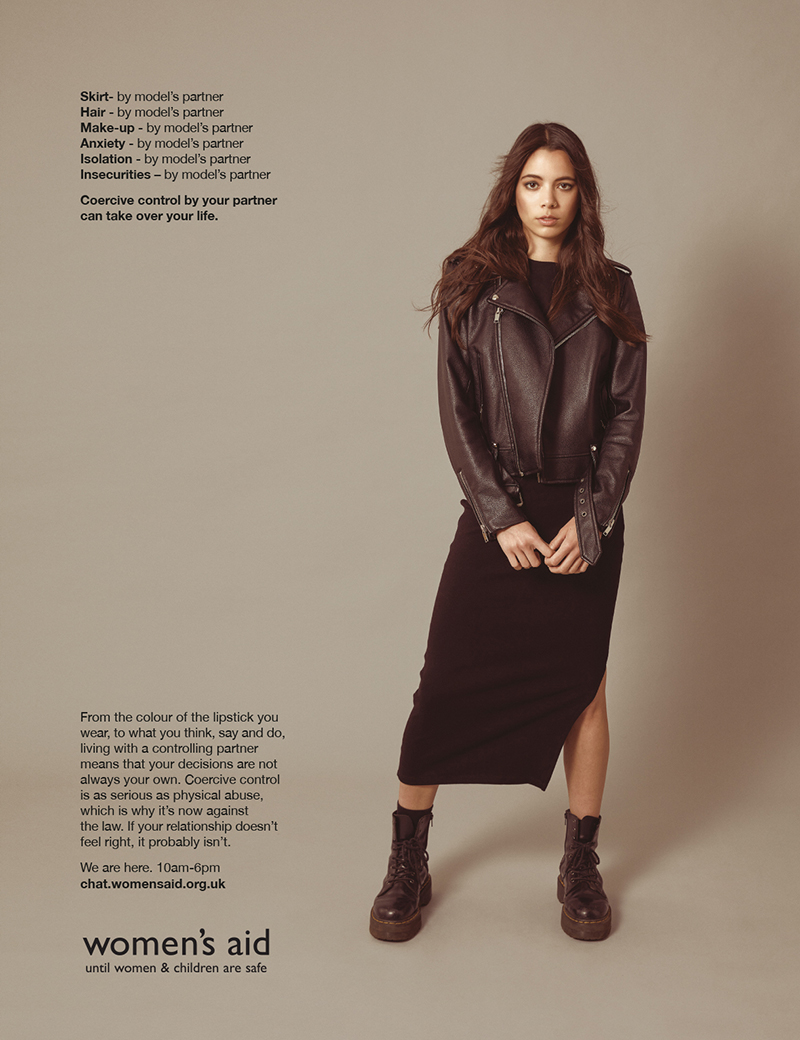 The “Not Model’s Own” print and outdoor campaign takes inspiration from fashion advertising and editorial in glossy magazines to demonstrate the devastating effect of this controlling behaviour on survivors.