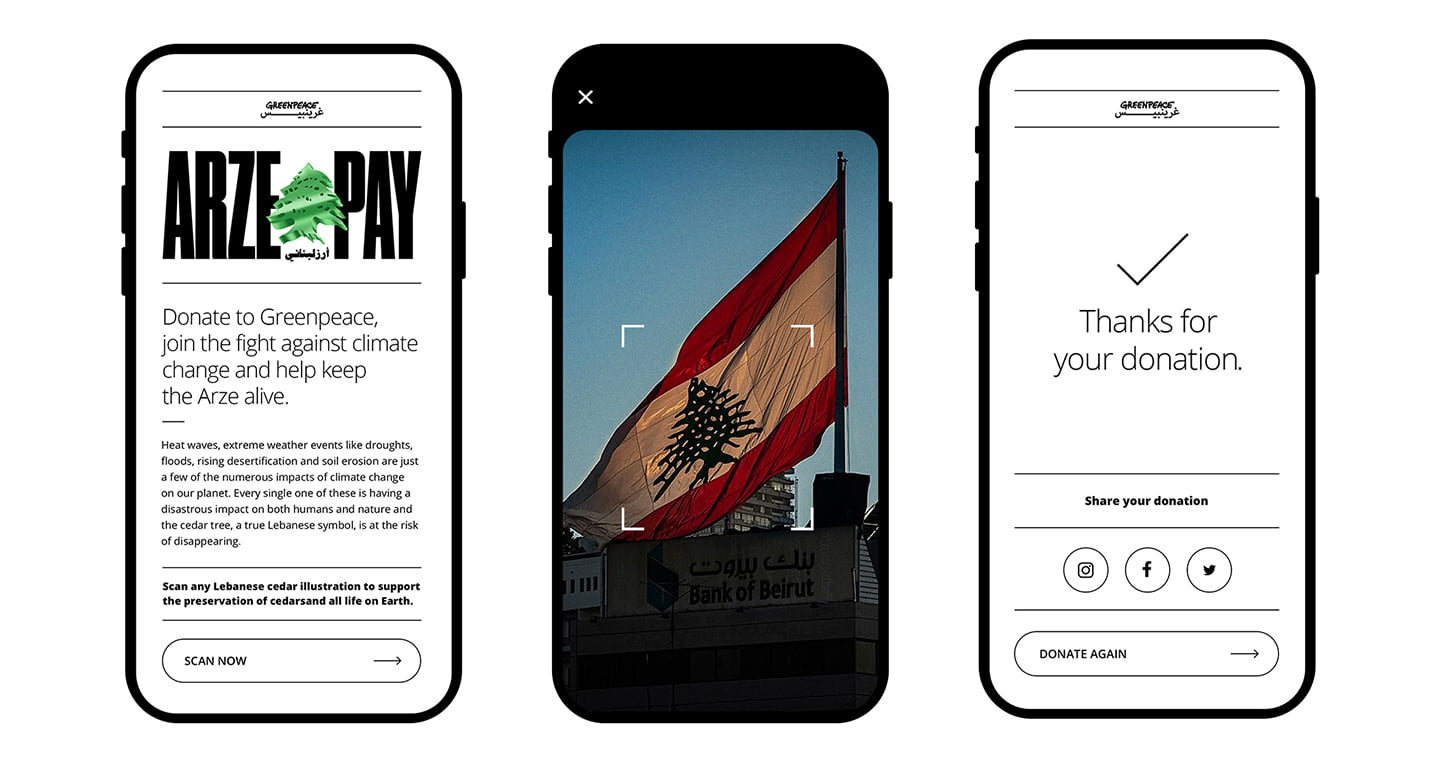 With this in mind, non-government organization Greenpeace and global marketing and technology agency Digitas Dubai created an interactive donation platform, ArzePay.com, to raise funds against the extinction of the Lebanese cedar tree, supported by a national campaign to drive usage in Lebanon. Through the use of machine learning and built-in cameras, users must first scan an image of a cedar design or illustration to prompt the next steps of making a donation, serving as a stark reminder to all that the Arze is an omnipresent symbol of national pride that needs to be preserved in reality.