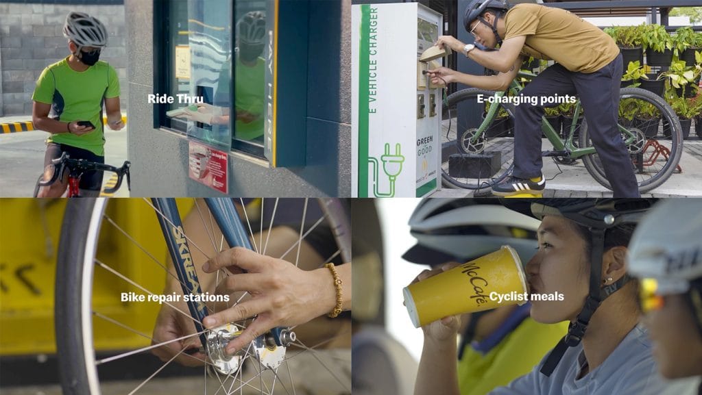 The movement began after McDonald’s noticed that more and more of its 700+ stores in the Philippines were becoming the stopover of choice for cyclists and began to invest in Bike & Dine infrastructure in 2021 – a McDonald’s Philippines innovation. Bike & Dine facilities include bike repair and e-bike charging stations, integrated bike racks and dining ledges and bicycle-safe “Ride-Thrus.” In a country where there are now four bicycle owners for every car owner, these facilities help address a bike-friendly infrastructure shortage: it can be difficult for cyclists to find safe places to take breaks, charge e-bikes, and make minor repairs.