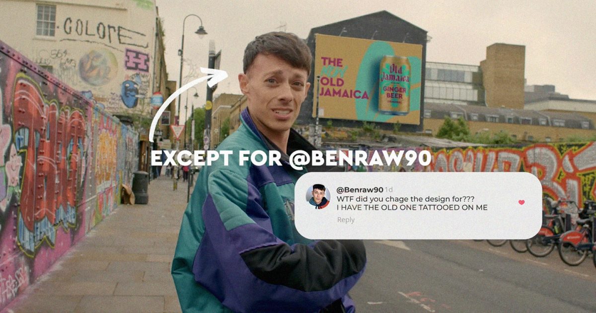 The campaign then centers on a hero film featuring Ben, the unfortunate fan who had the ginger beer’s old can design permanently inked before the brand refresh. Full of Old Jamaica humor, Ben’s frustration leads him to a tattoo parlor, where his outdated artwork is reimagined with the bold new look — courtesy of the brand.