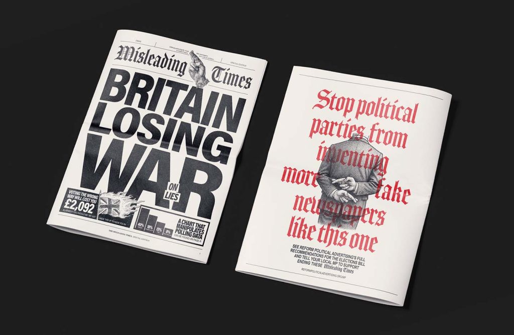 UNITED KINGDOM / AUSTRALIA – UK-based Reform Political Advertising (RPA), in conjunction with Clemenger BBDO Australia, has launched a provocative new campaign targeting Members of Parliament, delivering a satirical “fake newspaper” to Westminster to highlight the dangerous lack of regulation in UK election advertising. It uses the loopholes that parties exploit against them to push for reform.