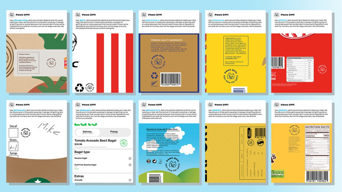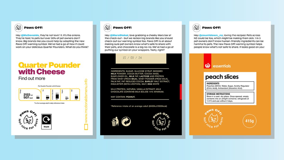 Shane Bradnick, CCO at TBWA\New Zealand, commented, “We’re really proud to launch this special project with our partners at Southern Cross Pet Insurance and NZVA. We hope the warning symbol is adopted by brands far and wide to help educate all humans on items that have the potential to make our pets sick. We’ve already had encouraging conversations with lots of brands and businesses about Paws Off!, and I’d like to invite anyone in the food and drink industry to reach out and support Paws Off! in some way. Seachange Studio also did an awesome job working with us to create the symbol and design system so it can be easily applied and used.”