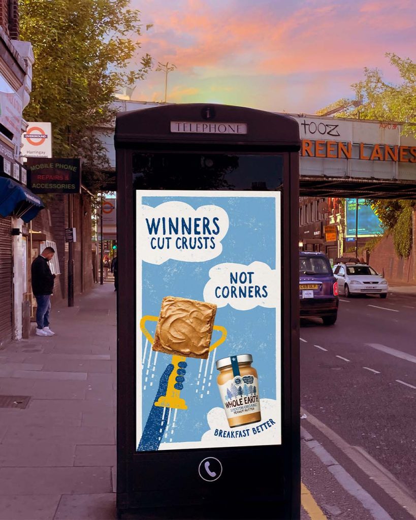 The OOH executions (three in total) feature delicious looking serves of whole earth playfully placed over striking illustrations and accompanied by witty headlines. One execution features a delicious looking peanut butter bagel rising in place of the sun with the headline “Rising is easy, shining is the tricky bit”, another execution sees the toast on top of an illustrated winners cup being held aloft, the text reads ‘Winners cut crusts, not corners’ and the final execution shows a rocket taking off with the headline “A head start starts with the stomach” all with the new line ‘Breakfast Better’.