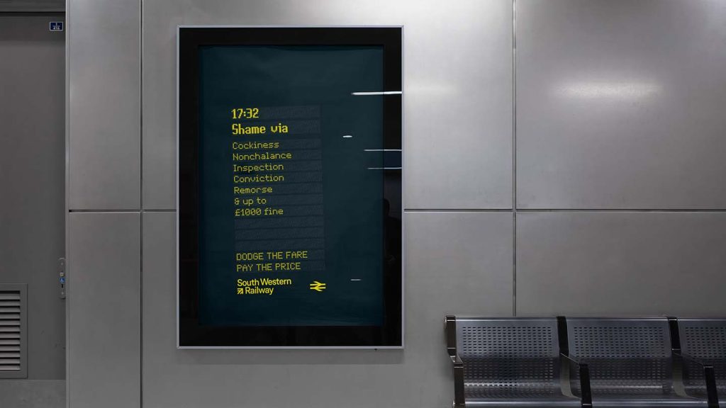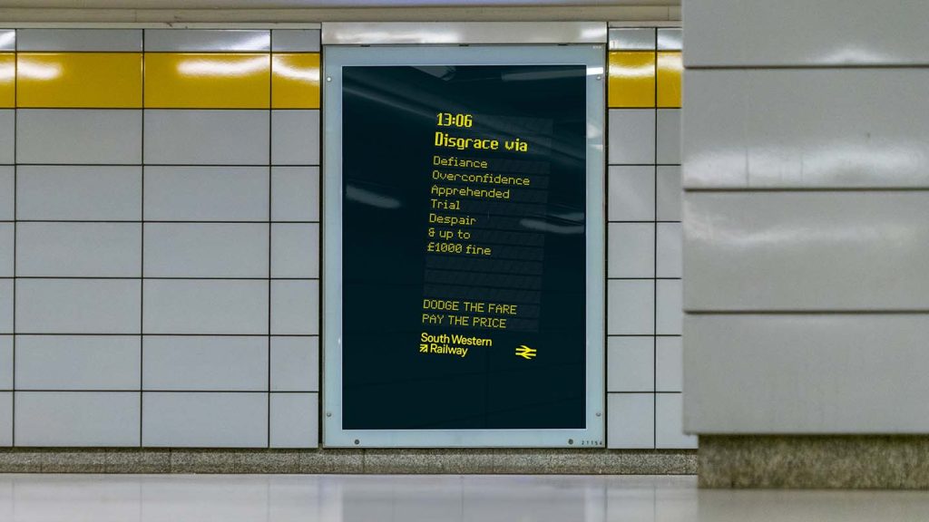 Instead of the names of stations, however, the destinations are the negative emotions that being caught without the right ticket can cause. Destination Regret, for example, calls at the stations Indifference, Caught, Court, Guilt and Up to £1,000 Fine. Other executions outline journeys to Disgrace and Shame, with all the creative using the endline “Dodge the fare, pay the price.”