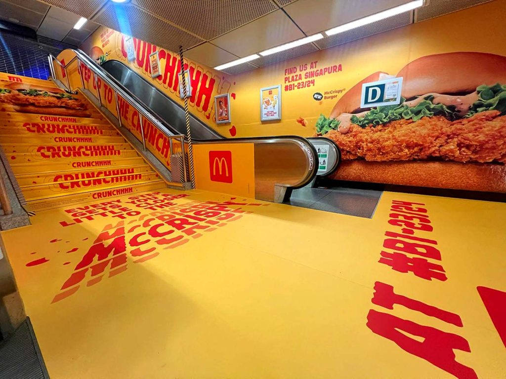 Strategically located at Exit D of Dhoby Ghaut station, the gateway to Plaza Singapura, where a McDonald’s outlet awaits – the activation is reinforced by striking floor-to-wall branding. Bold visuals of the McCrispy Burger, complemented by the brand’s iconic yellow, create an eye-catching takeover designed to capture attention in one of Singapore’s busiest transit hubs. With over 3.9 million monthly commuters passing through, the activation maximizes both reach and engagement.