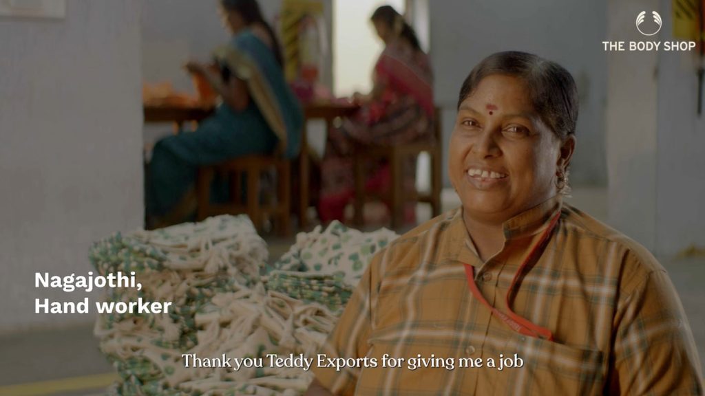 To make this festive season even more special, The Body Shop India introduced bespoke recycled cotton gift pouches, that customers can fill in with the treats they love. These pouches are skilfully crafted by Teddy Exports, The Body Shop’s first Community Fair Trade partner in India, and each one carries the uplifting stories of the incredible women working there. Teddy Exports not only provides a fair income but also meaningful employment to over 600 individuals, such as artisan Mrs. Murugeswari, who has been able to provide educational support for her children, or Mrs. Kasthuri, who has been able to receive training in tailoring in a supportive environment.