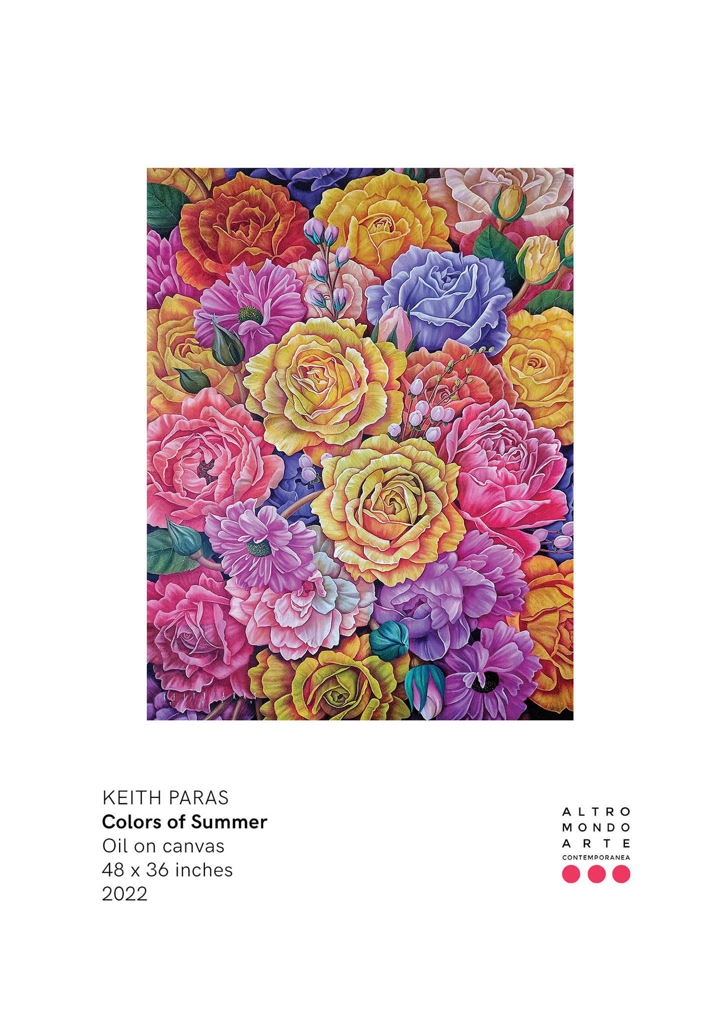 Keith Paras is known for his delicate renderings of clusters of flowers. For his solo exhibition titled Life in Colors, he channels these proclivities on canvas once again to create vivid, multicolored odes to nature and all its beauty. Each painting is adorned with vibrant flowers: roses, peonies, chrysanthemums, and dahlias — each representing positive connotations.