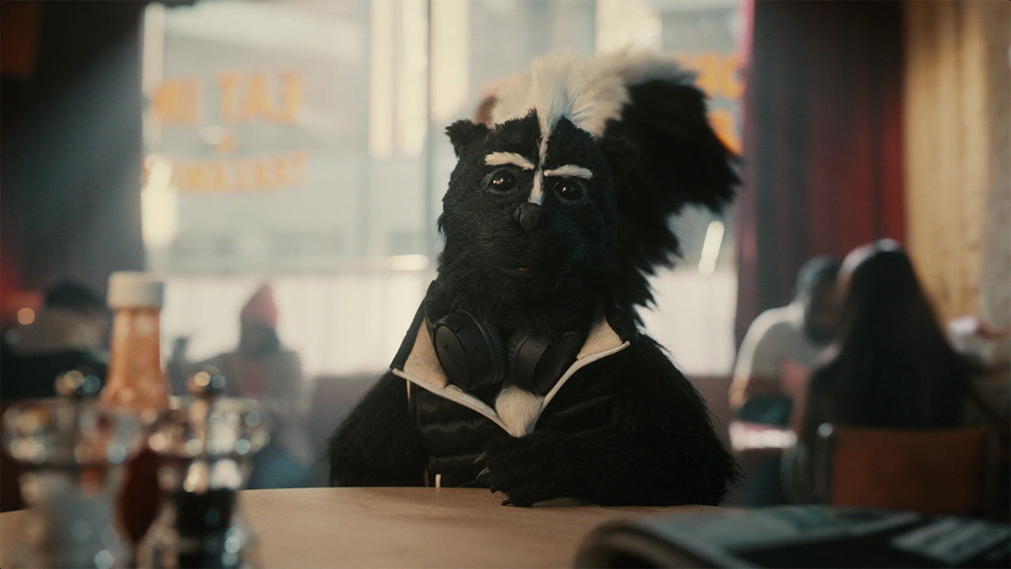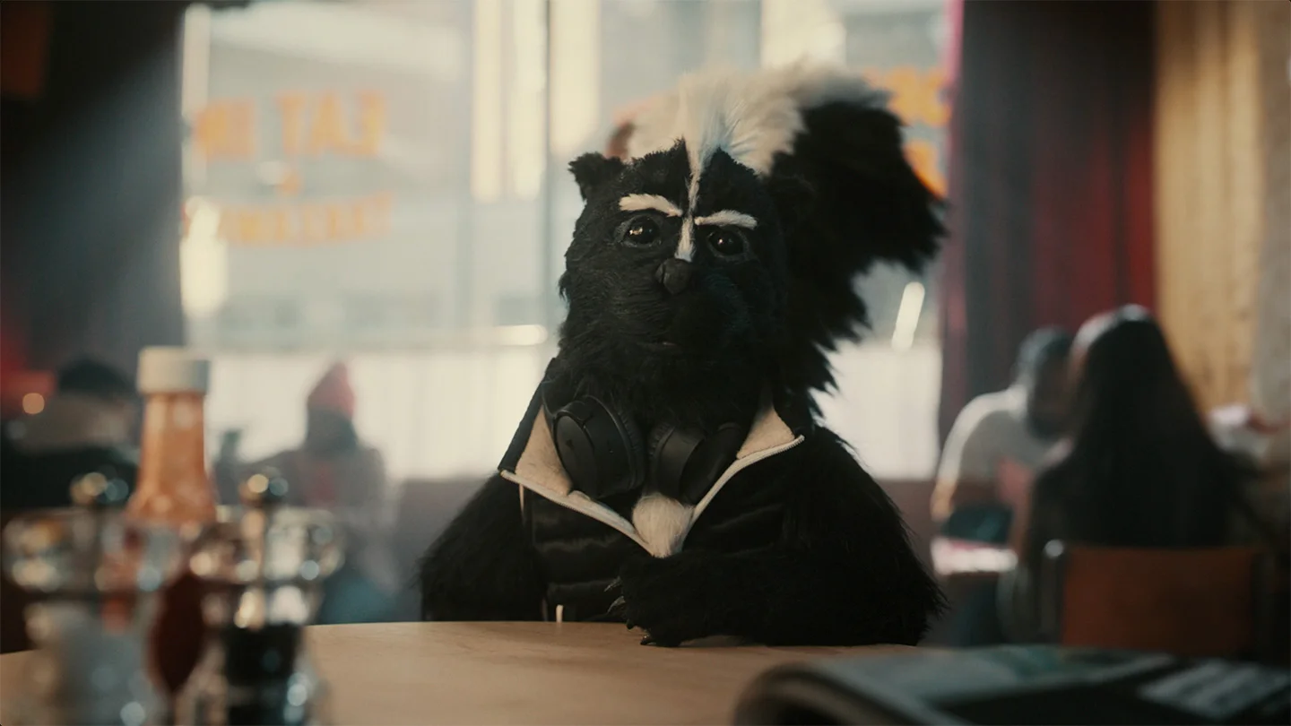 Jonny and Will, Directors at Blinkink, commented, “Bringing Skunk to life was great fun. In the puppet design process, we kept it super graphical, using black and white styling in line with the first direct branding. We all wanted a youthful, cheeky, likable character with a huge expressive tail. It was important to ground the puppet in the real world, interacting with the people around him. Keeping Skunk’s overall performance subtle helped to bind all the elements together and give the sense that he’s looking around and people watching in an everyday, relatable setting, lit with natural light.”