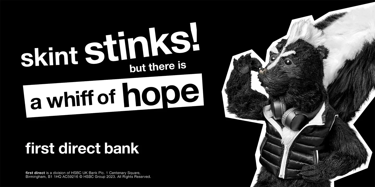 Chris Wood, Head of Brand and Marketing at first direct, said, “This new campaign is here to demonstrate how first direct can help a generation of younger customers who are feeling more concerned than ever about their financial situations. Skunk brings our offering to life perfectly, using relatable situations and clever quips to show how first direct’s products and services can give people the chance to live a better life through the financial decisions they make.”
