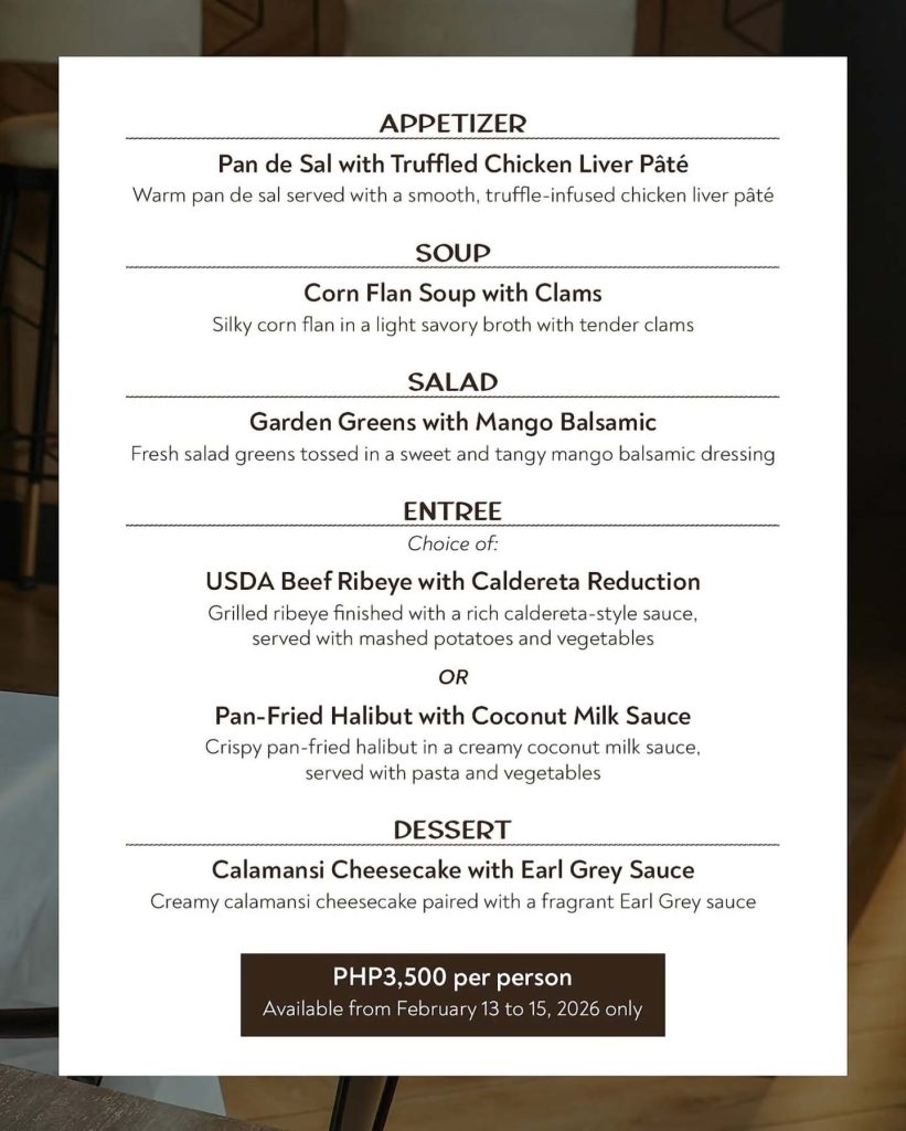 Standing behind the bar is Celtrick Sante & Zedric Del Mundo, whose philosophy marries place with feeling. Their Valentine’s Day lineup is both romantic and rooted in Filipino sensibilities, featuring thoughtfully sourced local ingredients: