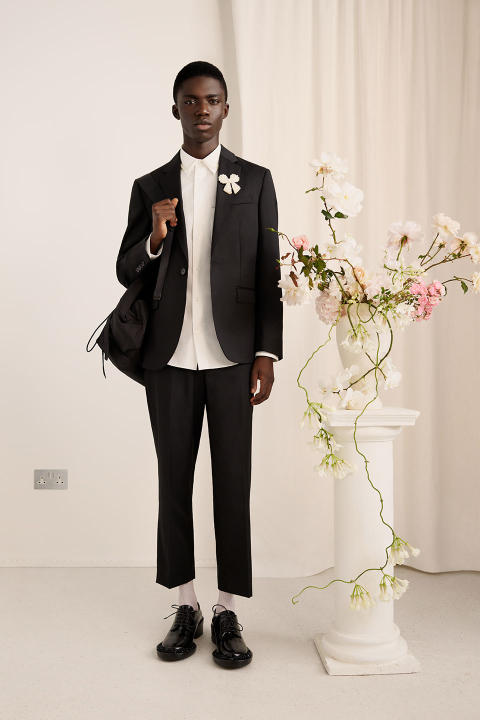 For Rocha’s menswear debut, there are riffs on her classics; a reworked trench, with pearl embellishments on the collar, a rounded summer parka, Aran knits and cardigans, classic wool suiting and a vibrant checked blazer with matching drawstring trousers. There are shirting, hoodies and t-shirts in colour pallets of white, pink and black as well as some printed with photographs by Jacob Lillis, a long-term collaborator of Rocha’s. The majority of the men`s collection will be available in sizes EU 46 to 52/54.