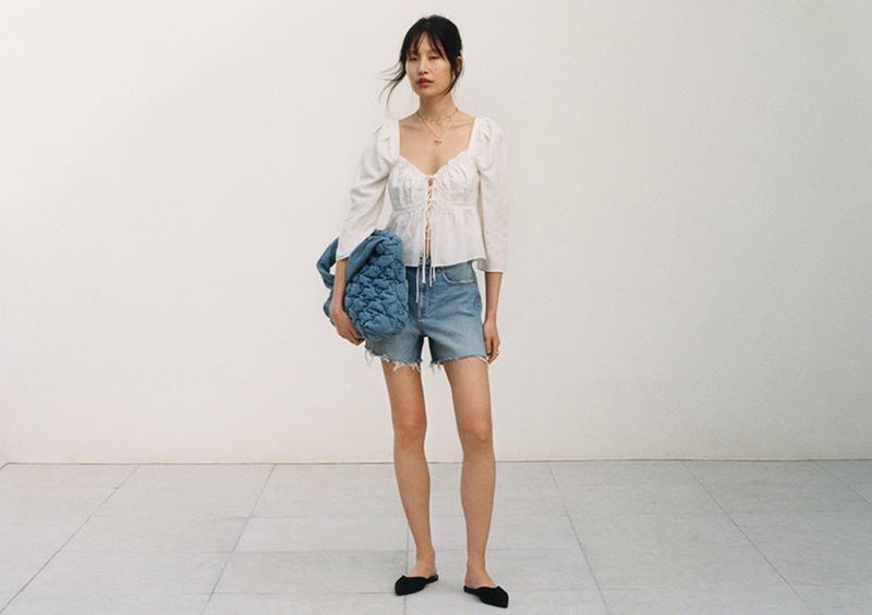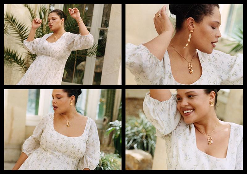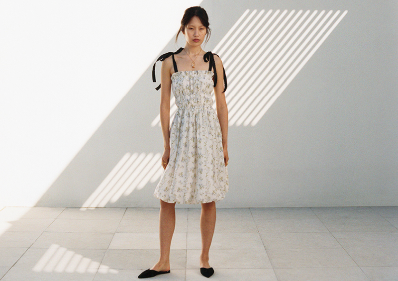 The collaboration features signature Brock Collection pieces, a softly romantic yet city-ready range of dresses, blouses, tops, denim jeans and denim shorts, plus shoes, jewellery, handbags and sunglasses. Fitted shapes and dreamy ruffle details effortlessly mingle with flowing fabrics, voluminous skirts and statement balloon sleeves. The colour palette consists of black, pale pinks, off-white, cream and washed denim. The collection is made from more sustainable materials – organic linen, organic cotton, recycled cotton, recycled polyester and Tencel™ Lyocell.