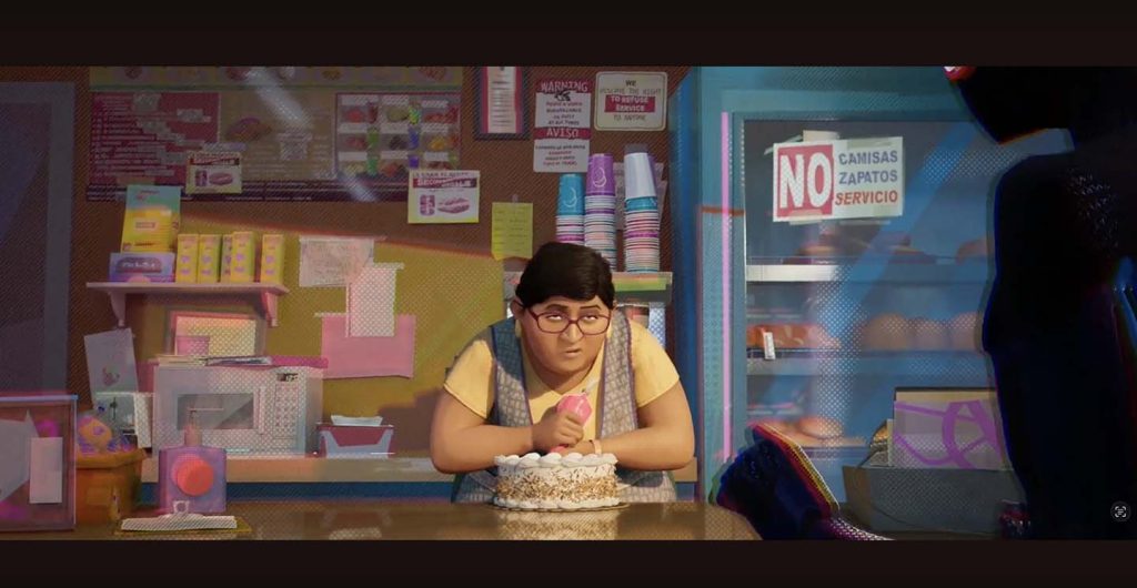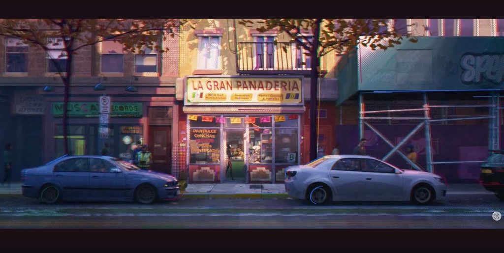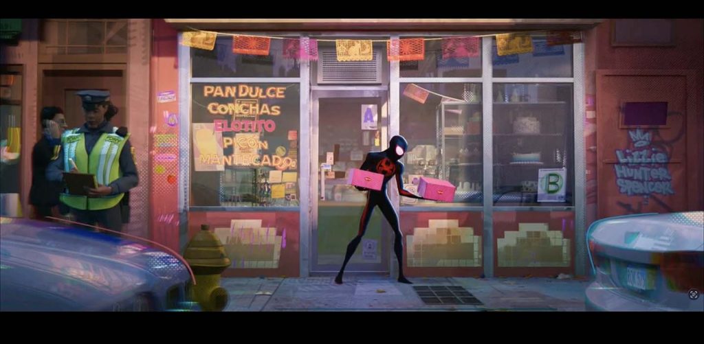 Wendell explained that these small but meaningful details help sell the idea that the main character is, for instance, about to walk into a Brooklyn panaderia. There is a scene in Spider-Man: Into the Spider-Verse that shows a bakery in Brooklyn, where Miles buys a cake for his dad’s promotion party. Such details also connect the setting to the audience emotionally, as they help viewers remember the feeling of “being” in the panaderia.