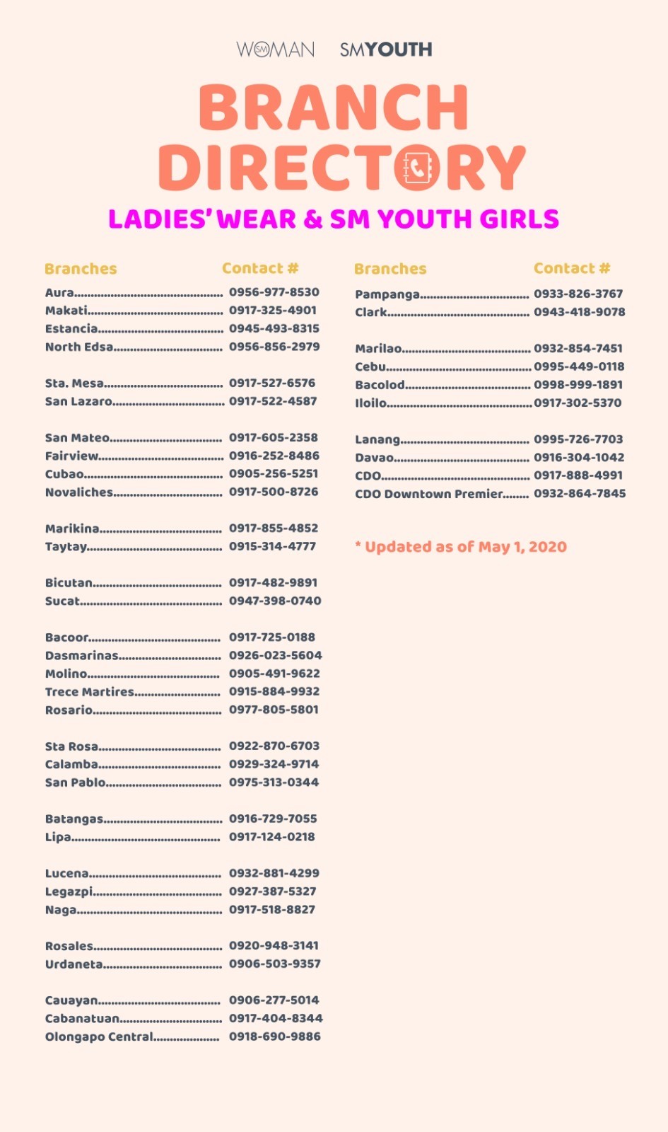 Shop Essentials from Home may be done by visiting ShopSM.com or availing the Call to Deliver service by simply messaging the The SM Store branch of your choice (branch directory is attached), or messaging each brand on social media: