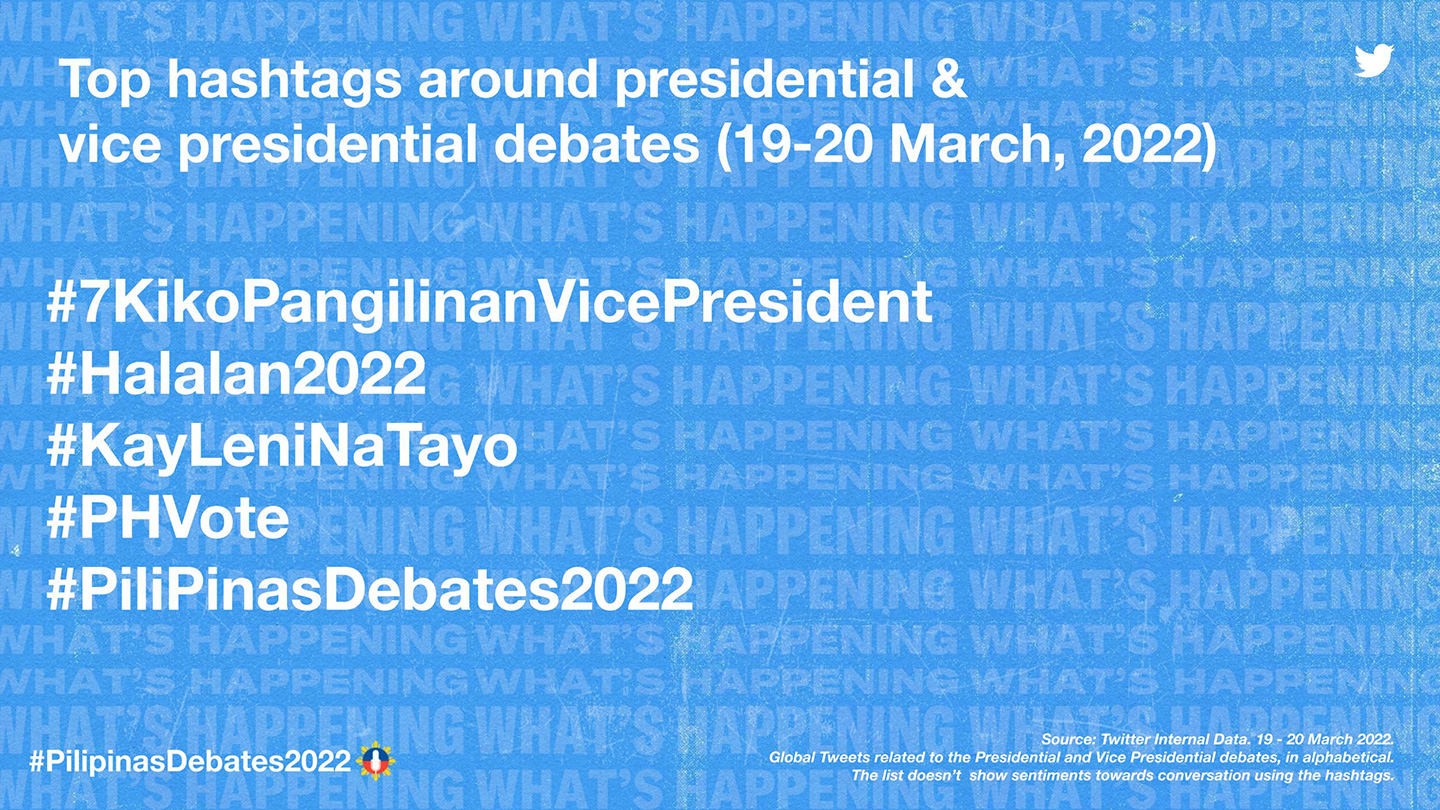 Filipinos on Twitter actively shared their opinions and reactions, spurring healthy conversations about the debates. Among the top hashtags from the debates were #PiliPinasDebates2022, #KayLeniNaTayo, and #Halalan2022 (in alphabetical order).