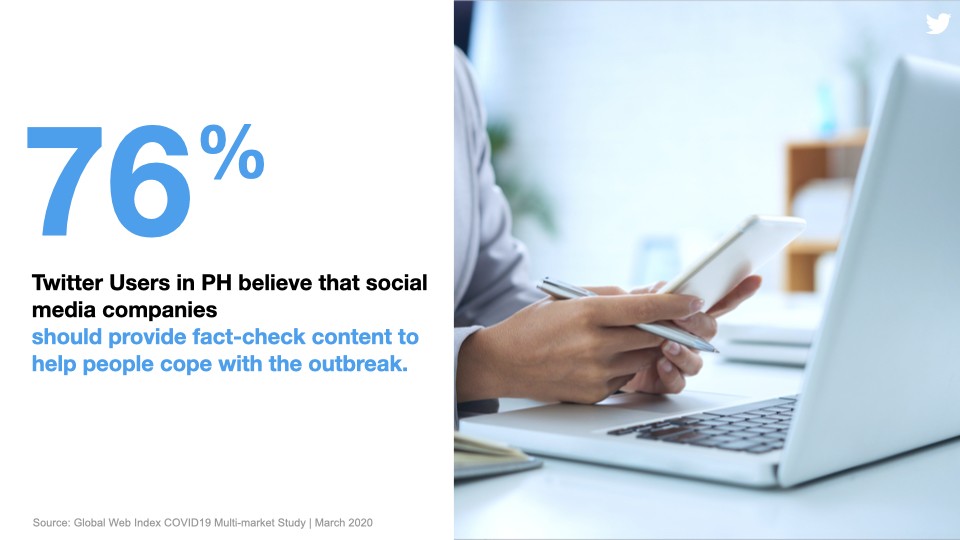 According to the Global Web Index, 76% of Filipinos on Twitter believe that social media companies should provide fact-check content to help people cope with the outbreak. With this, Twitter launched a dedicated COVID-19 Events page and #COVID19 search prompt to bring credible information from official authorities and accounts. To use the COVID-19 Events page feature, go to the Explore tab if using a desktop or see the top of the home timeline for mobile users. To see all of the latest steps Twitter is taking in response to Covid-19, visit covid19.twitter.com.