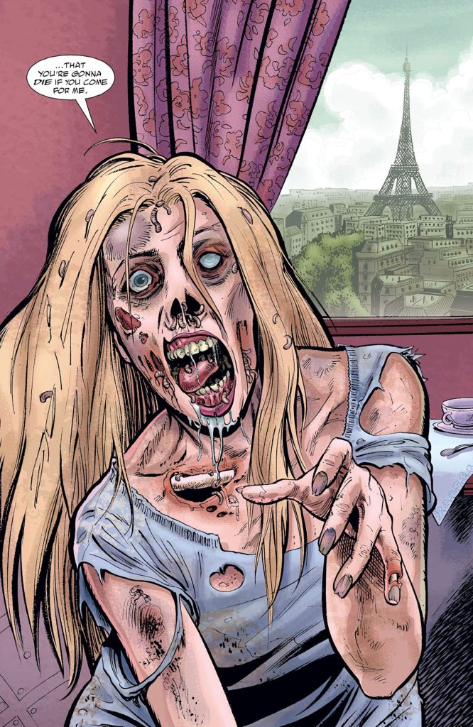 Yorick is finally on his way to be reunited with his girlfriend Beth. However, on a train to Paris, his protector and friend Agent 355 in a scantily-clad S&M outfit tries to seduce him. As Yorick tries to resist her advances towards him it’s completely unexpected when the next page opens to a decaying Beth (her skin melting, nose gone, and one eye socket showing). It may have been a dream but it is the ultimate jump scare in comics.