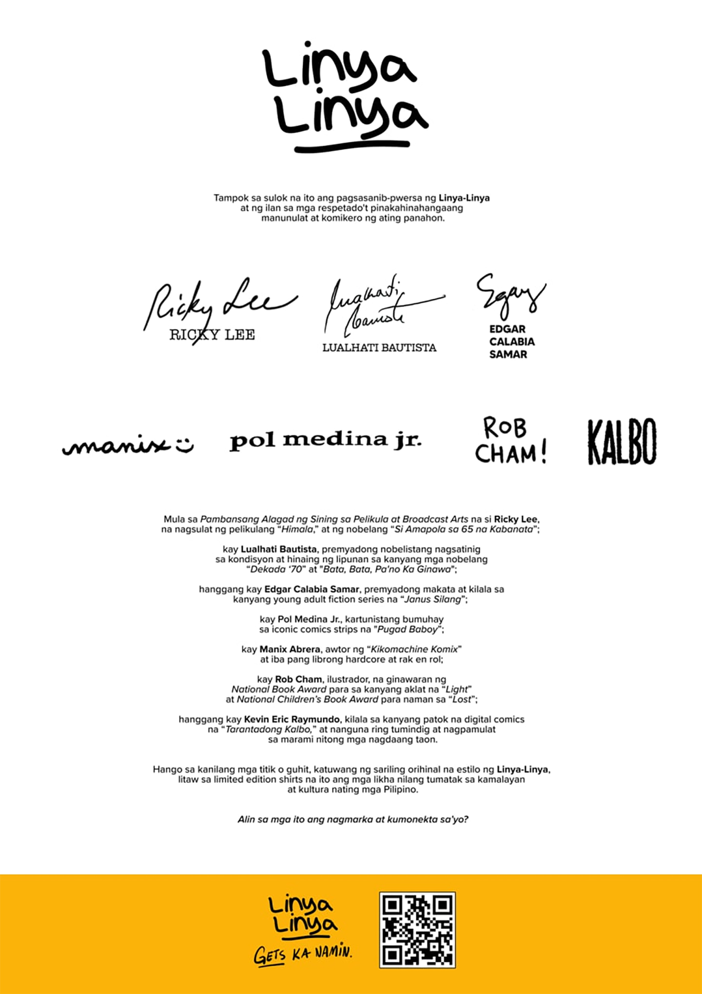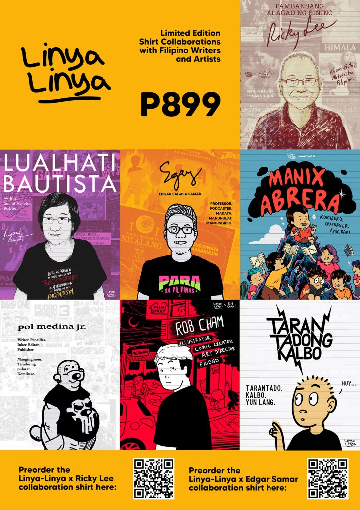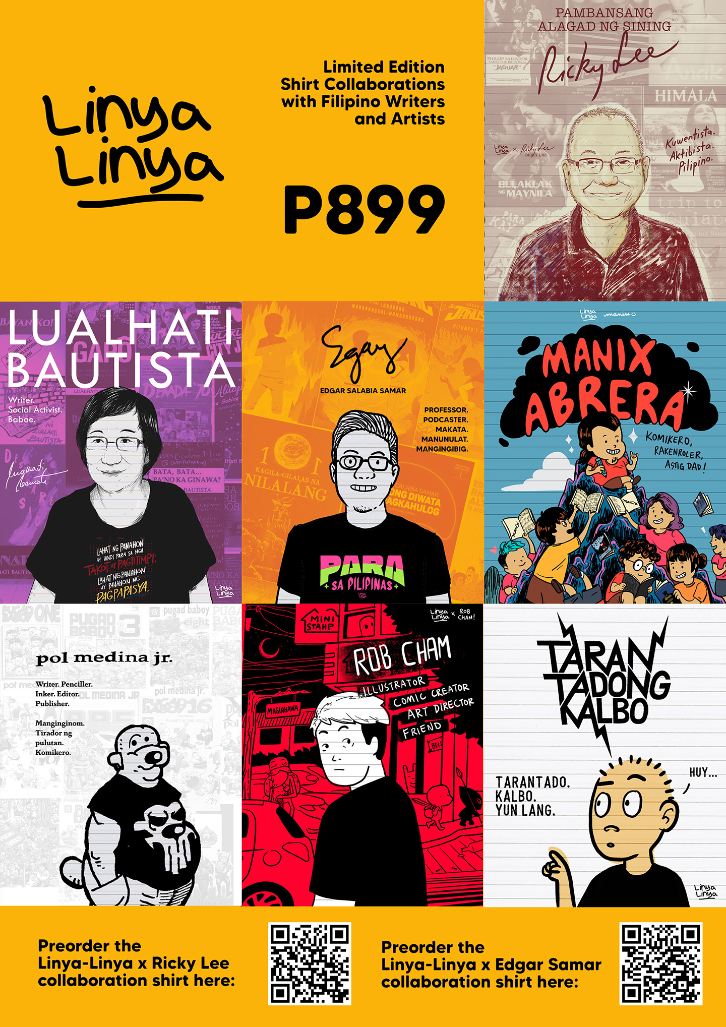 MANILA, PHILIPPINES — To celebrate this year’s Buwan ng Wika, Philippine shirt brand Linya-Linya is partnering up with bookstore Fully Booked to bring Filipinos the best of local writers and artists. Collaborating with renowned figures like National Artist Ricky Lee, award-winning fictionist Lualhati Bautista, poet and novelist Edgar Samar, legendary creator of Pugad Baboy Pol Medina Jr., the mind behind Kikomachine Komix Manix Abrera, esteemed graphic novelist Rob Cham, and the man who brought Tarantadong Kalbo into life Kevin Raymundo.