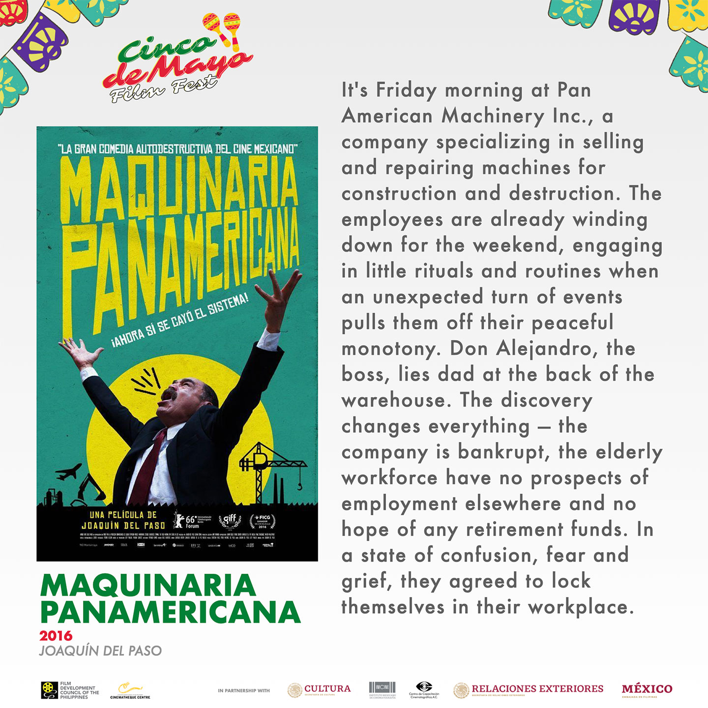 Cinco de Mayo Film Fest will open its doors to moviegoers with five (5) thought-provoking and award-winning movies from Mexico. These films include Maquinaria Panamericana (2016), a film by Joaquin Del Paso, showcasing the effects on workers of the death of their boss to surreal and engaging impact with no prospect of employment elsewhere, no retirement fund, and worst, the company is in bankrupt. The film was awarded Best Mexican Film & FIPRESCI Prize at the Guadalajara International Film Festival, Best First Film at the Tucuman Film Festival, and Best Film at the Leyva Film Festival.