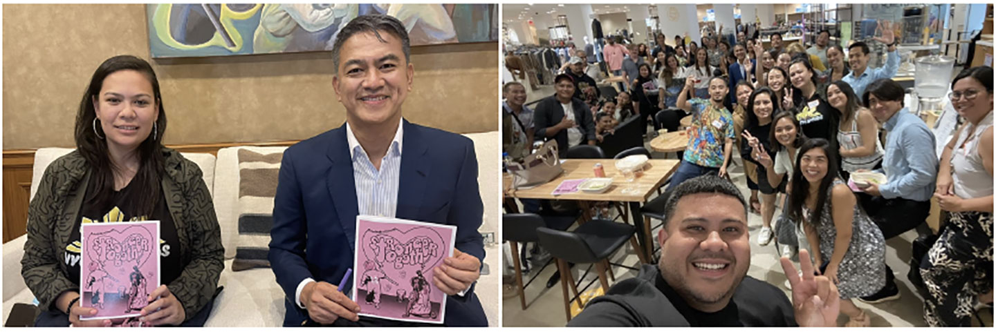GMA Pinoy TV also met with various Filipino Communities in the US: Fiesta in America President Nanding Mendez, Filipino Young Leaders Program (FYLPRO) 2022 President Leezel Tanglao and FYLPRO Treasurer Frederick Alain Docdocil, and Filipino American Arts Exposition (FAAE)’s President Al Perez toured them at the Calligra Filipino art display with artist Ian “Taipan” Lucero at the PCG San Francisco building.
