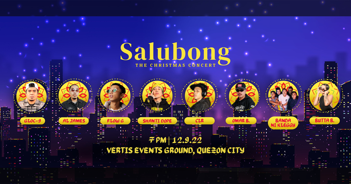 Raising the bar from last year’s pioneer event, Salubong: The Christmas Concert Year 2 will be another whopper. A star-studded stage full of the country’s biggest and most stellar names in hip hop brings Gloc-9, Flow G, Shanti Dope, AI James, Omar B, and CLR together in one tongue-twisting, mind-blowing, never-ending dance gig like no other.
