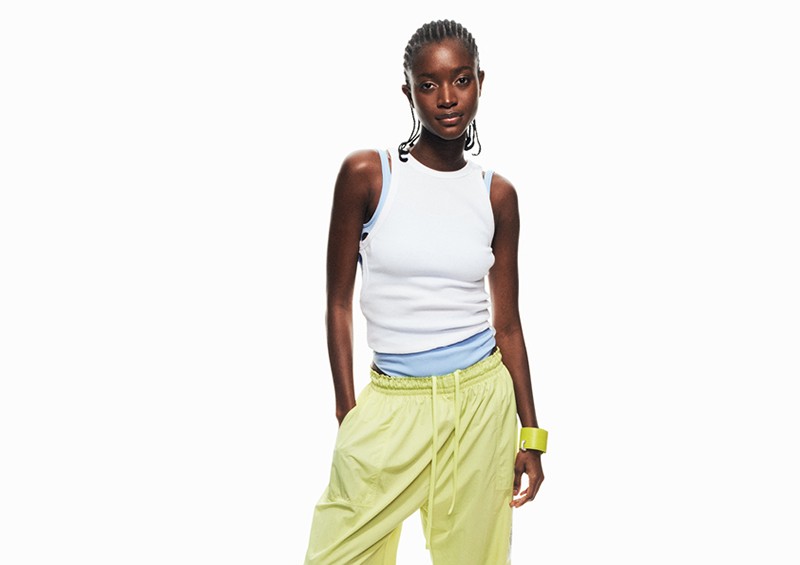 The first collection to launch under the collective is Science Story, which pays tribute to the brilliant minds behind fabrications of the future. With it, we introduce new materials such as EVO by Fulgar®, a bio-based yarn derived from castor oil, and Desserto, which is a plant-based alternative to leather, produced from cactus plants. Key womenswear pieces include the wide-leg bright white jeans with removable double waistband, the lightly-cropped chalk-white shirt with oversized breast-pocket and the cuffed tracksuit. Energetic and bold accessories are the edgy antidote to the collection’s clean and classic clothing; the chunky necklace with orange swirls and rhinestone detailing, coordinating statement loop rhinestone earrings, high-heeled green strap sandals and recycled plastic blue sunglasses with a double-lens frame.