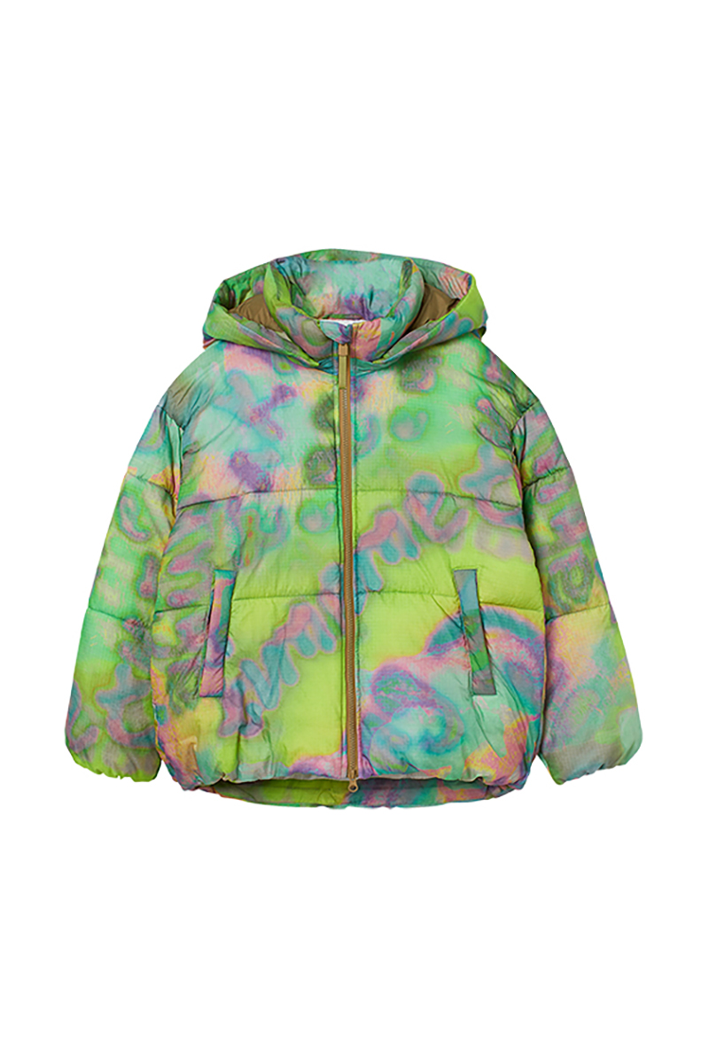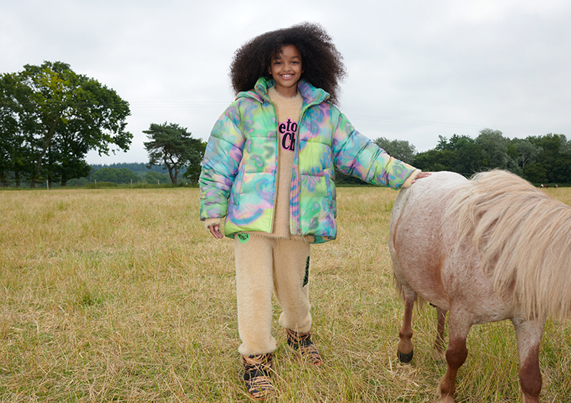 For kids, one-size-up recycled nylon anoraks and FLWRDWN™ puffer jackets come in exuberant hues, while T-shirts and loungewear are enlivened with slogan patches that declare allegiance to the animal kingdom and support for PETA’s work.