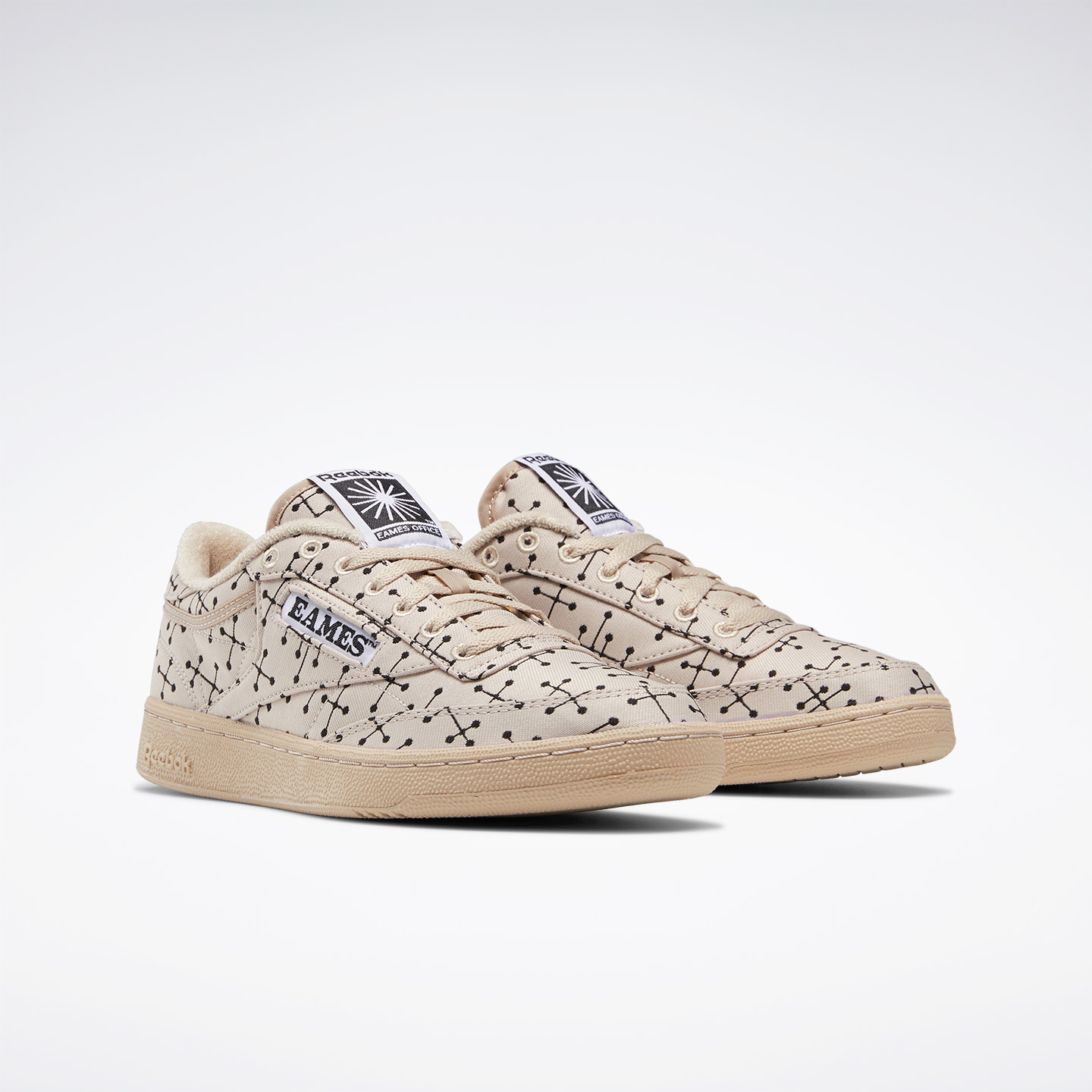 Reebok x Eames – Club C ‘Dot Pattern’ is awash with the Dot Pattern textile print that was considered but not submitted by the Eames Office to MoMA’s 1947 Competition for Printed Fabrics. A field of dots are joined by tiny sinews that bring order and proportion to a field seemingly scattered at random. Dot Pattern expresses the interconnectedness of Eames design. Though all work done by the Eames couple in their staggeringly productive lifetimes was their joint achievement and vision, the image of Ray holding the final drawing still dazzles. The iconic print is deftly softened by a natural upper that rests on an unassuming raw rubber sole.