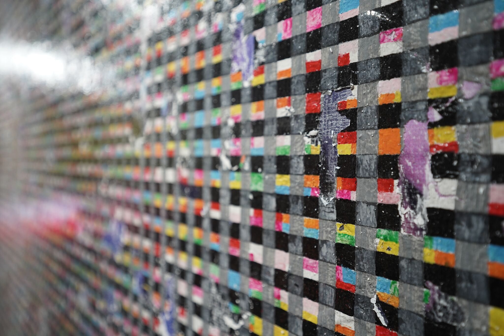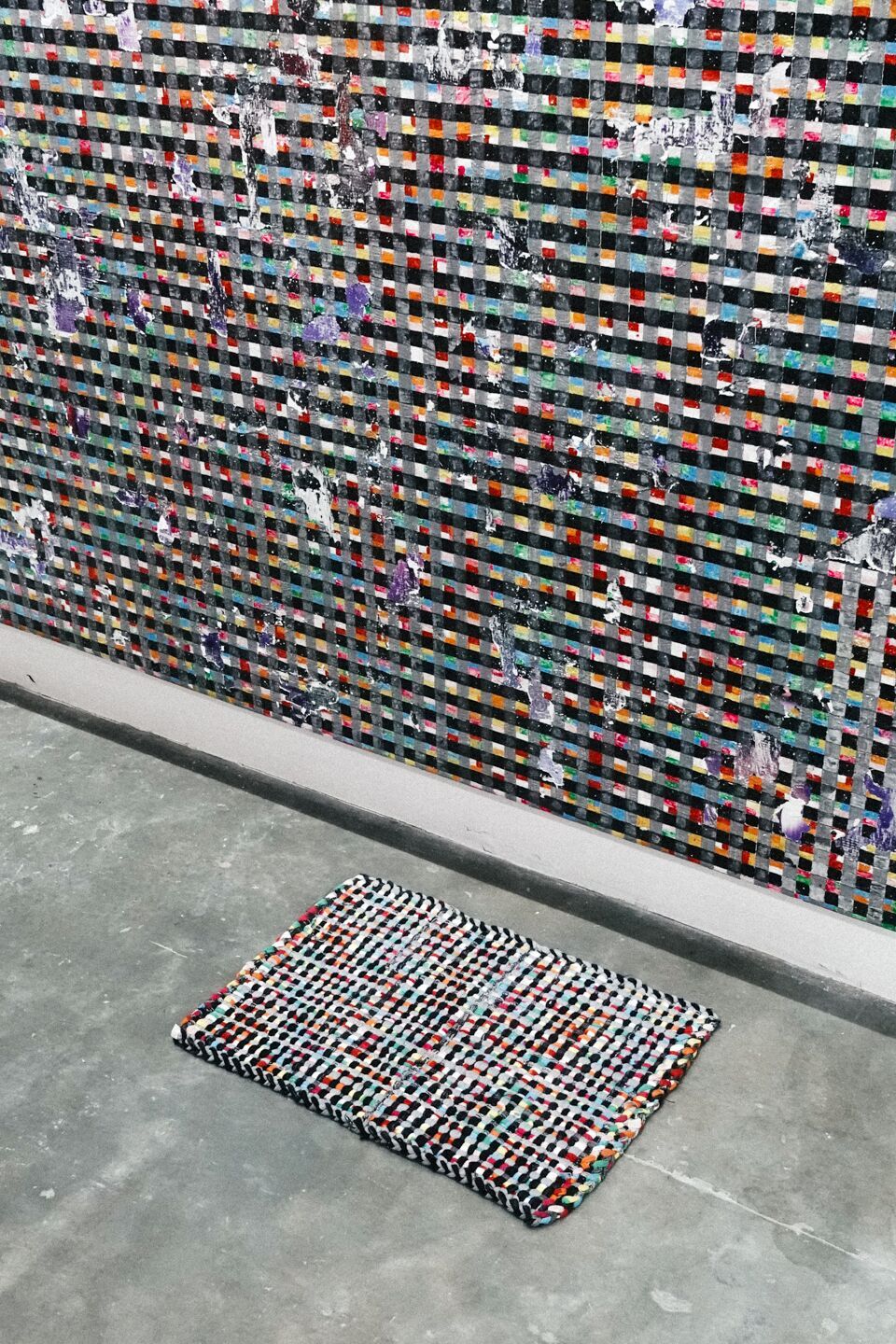 Ardeña’s paintings mimic the look of the basahan, a common household mat seen at the entrance/doorstep of the house, alternatively used to wipe the floor. His paintings are labor-intensive, created with layers upon layers of paint distressed on top of tarpaulin. In this series, Ardeña pushes the boundaries of what we perceive paintings to be; at the same time, he creates a playful twist on the domestic narrative of objects we wouldn’t normally consider as art.