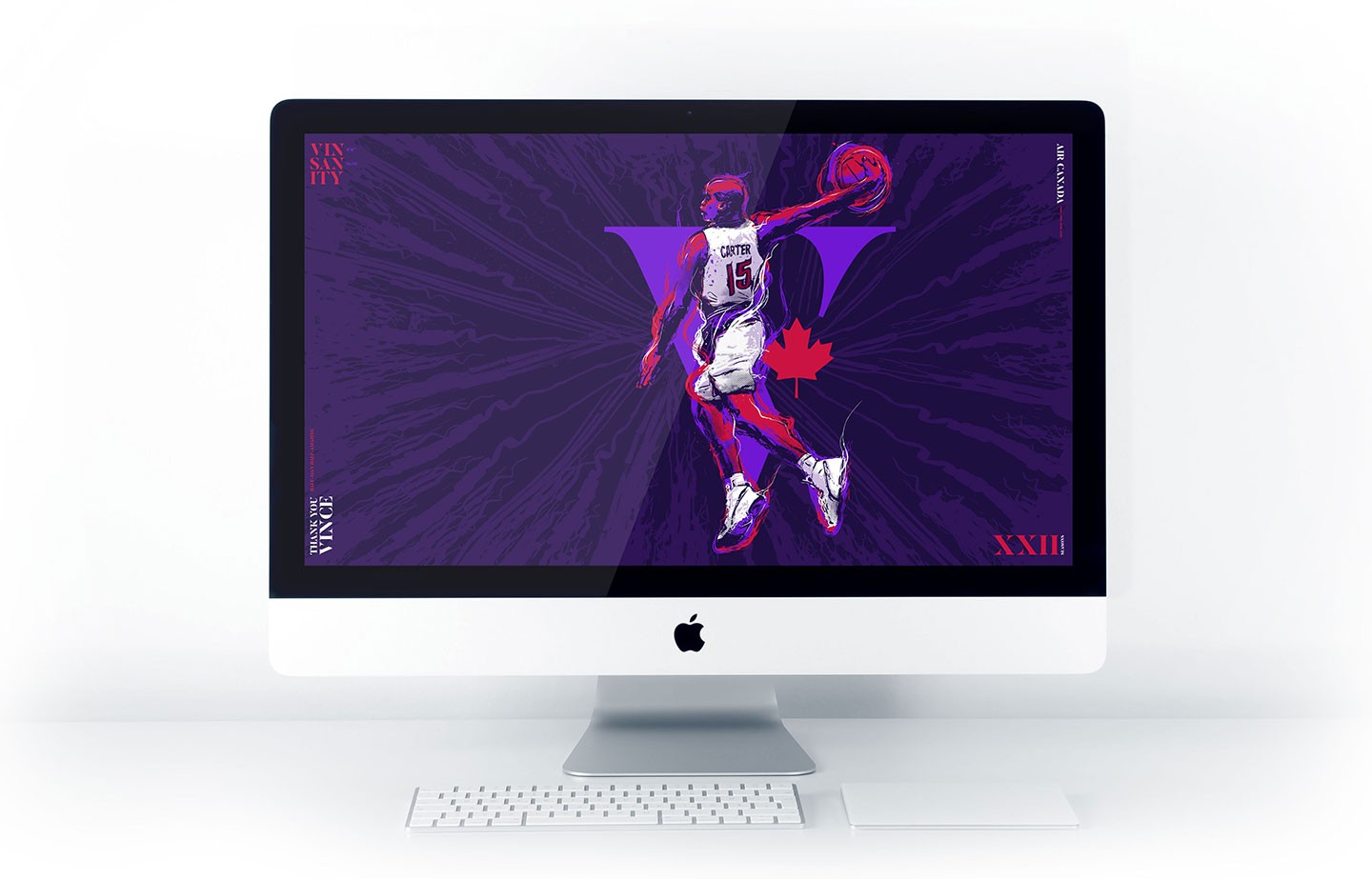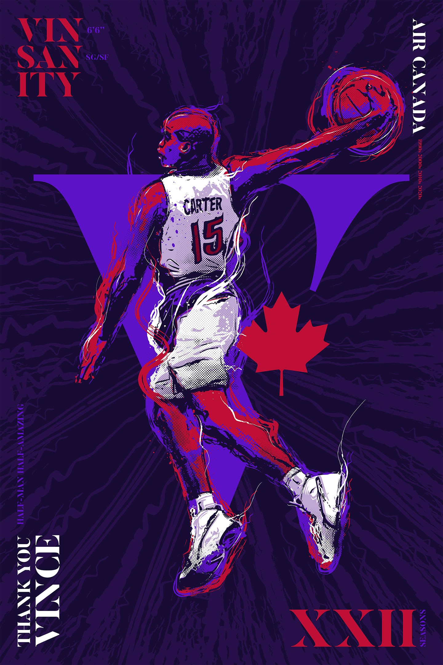 AJ’s work featuring “Half Man, Half Amazing” shows Vince in flight and about to throw down a vicious dunk while a purple “V” and a Canadian maple leaf (a symbol of Canada known worldwide) are in the background. The words “Vinsanity” and “Thank You, Vince” are on the edges, while the Roman numeral for 22, XXII is on the lower right corner of the art signifying Carter’s 22 years in the NBA.