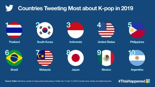 While Kpop gained popularity in South Korea 25 years ago, it is only in recent times through the power of millennial fans worldwide that Kpop-related conversations have gained traction across the world on Twitter. Here are the top 10 countries that Tweeted the most about Kpop in 2019: