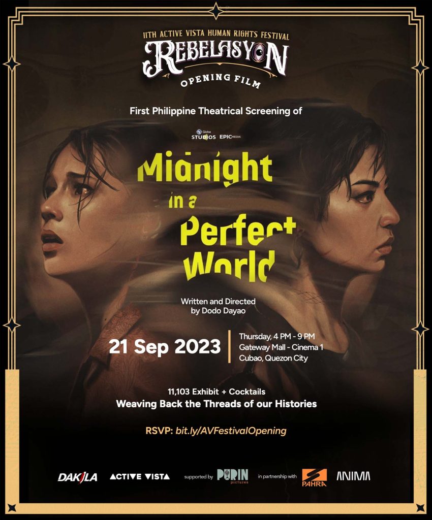 MANILA, PHILIPPINES — In commemoration of the 51st Martial Law declaration, artist-activist DAKILA and its human rights education center Active Vista launched the Active Vista Human Rights Festival (AVHRF) with the first Philippine theatrical screening of Dodo Dayao’s Midnight in a Perfect World on September 21 at Gateway, Quezon City.