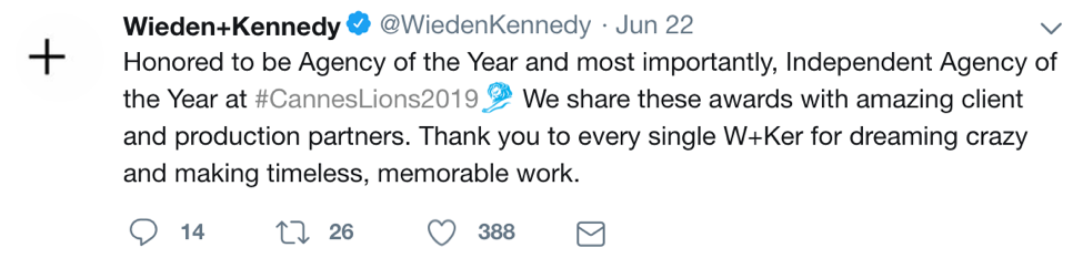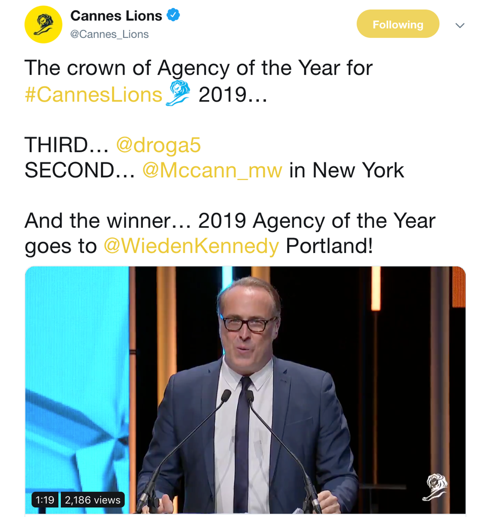 As the 66th Cannes Lions International Festival of Creativity came to a close last Friday, the recipients for two of its most coveted honors – “Network of the Year” and “Agency of the Year” – were revealed. The former honored McCann Worldgroup who received 73 Lions throughout the week, while the latter was awarded to Wieden + Kennedy Portland.