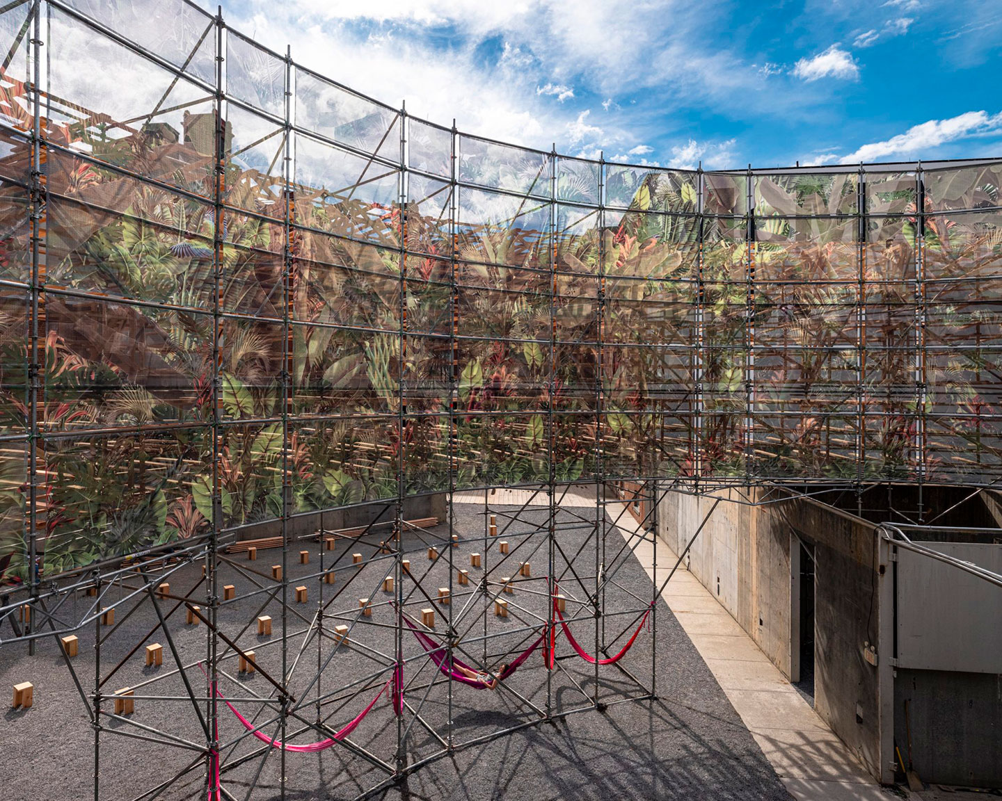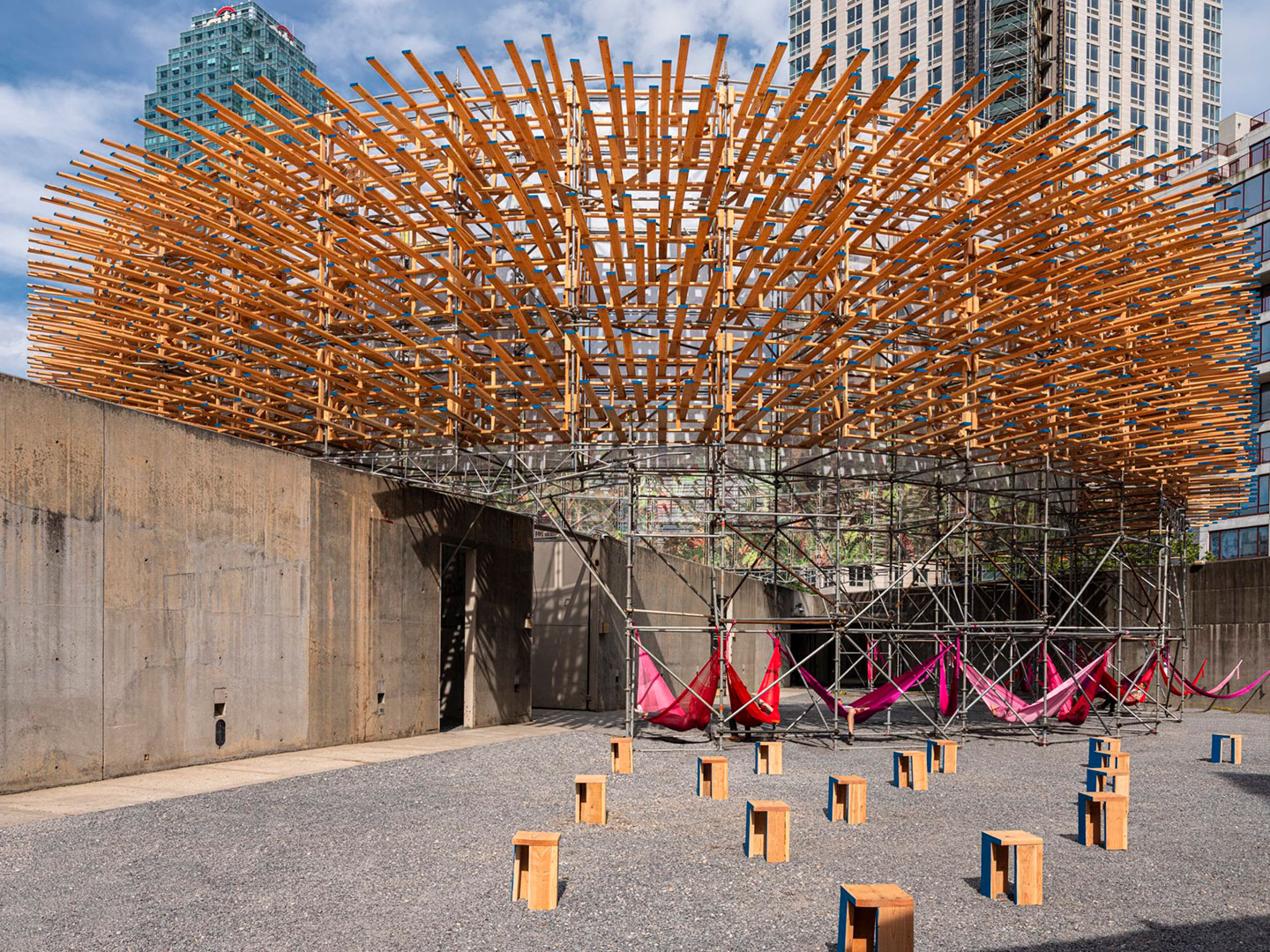 scaffolding that sits atop the courtyard of MoMA PS1 and catapults visitors into a wild, foreign territory. The nearly 40-foot-tall, 90-foot-wide structure hovers over the courtyard space, reframing the horizon and positioning visitors in an urban jungle. The presence of this large circular structure reconfigures the courtyard into an immersive environment that visitors can move in and out of, contrasting with the cityscape immediately adjacent to the Museum. Amplifying the experience, the installation features hammocks crafted in the south of Mexico along with a functioning waterfall. The exterior of the structure features protruding wood “bristles” that create a dynamic sense of movement.