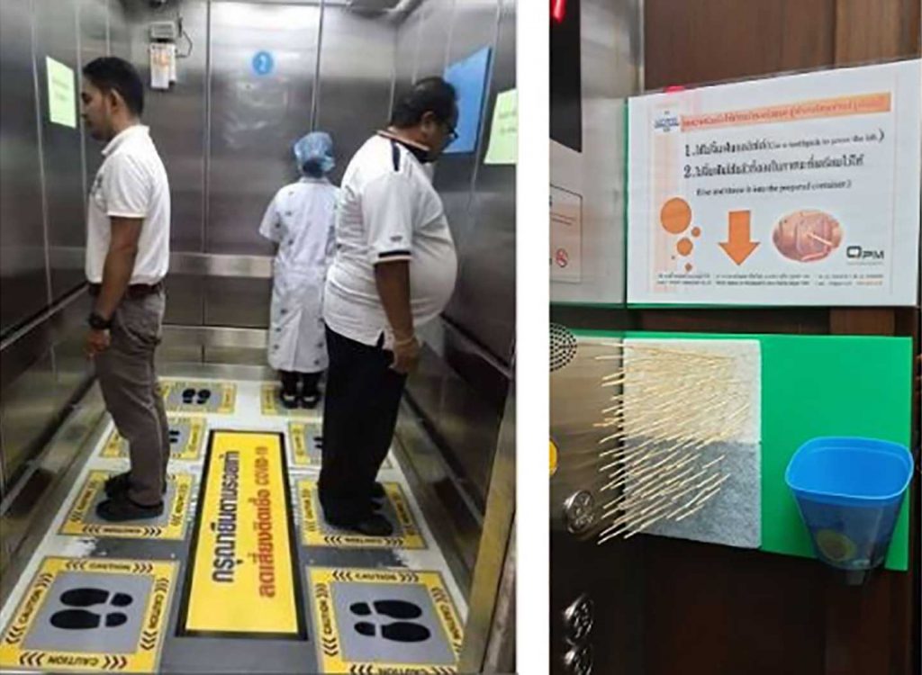 In addition, unique social distancing measures have emerged. On elevators, tape is used to indicate where to stand and people stand facing the walls. Plus, toothpicks are taped to the elevator walls in great number, with a sign advising not to push the buttons directly, but to use a toothpick. This could readily be implemented elsewhere, too.