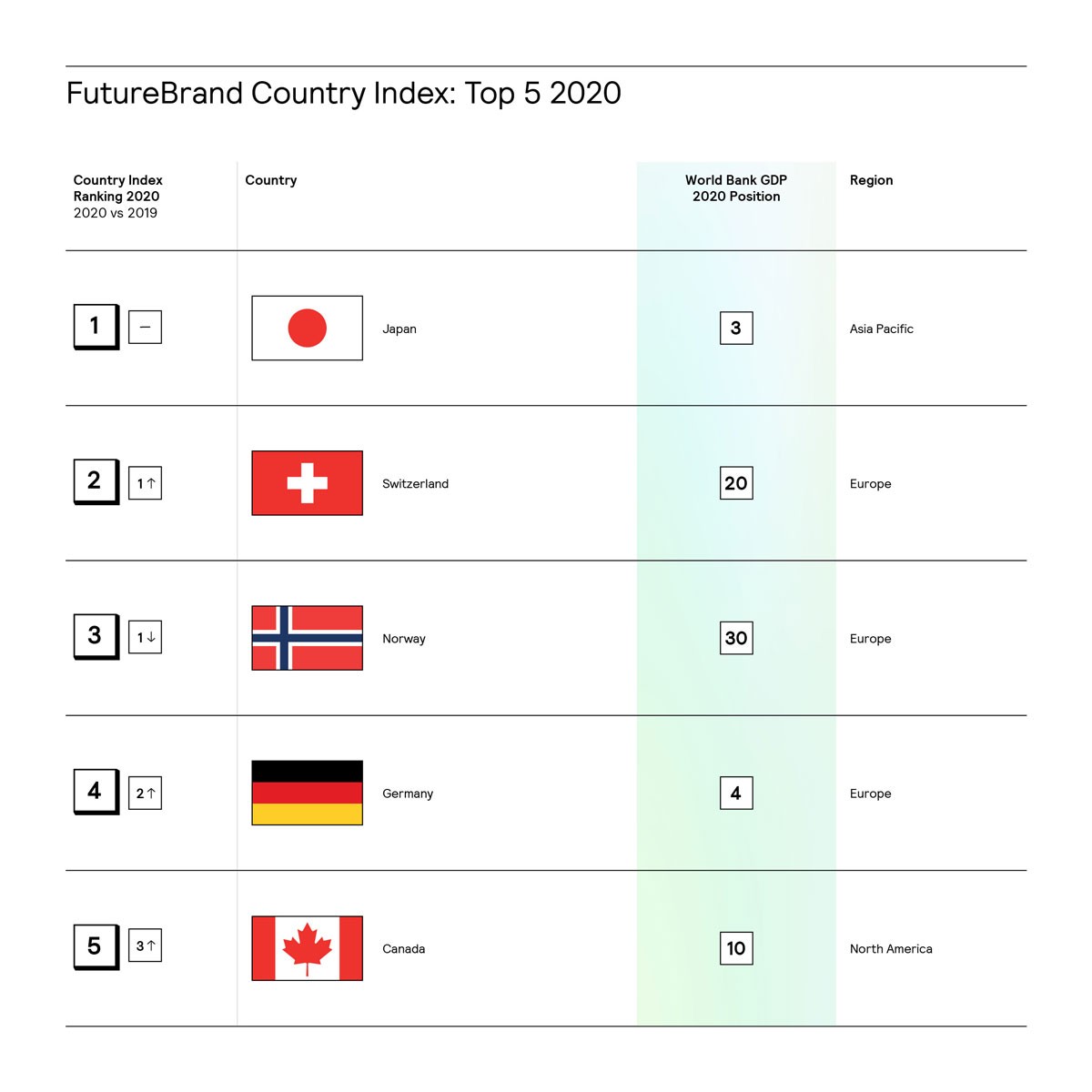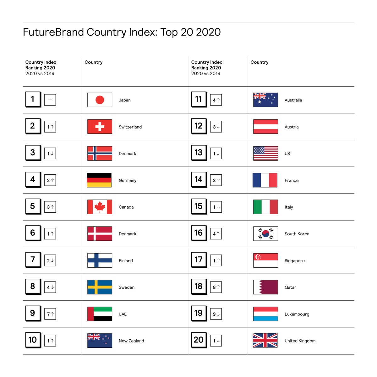LONDON, UK – FutureBrand, the global brand transformation company, has today launched its 2020 Country Index, providing in-depth and nuanced rankings of global country brands. Conducted six months into the coronavirus pandemic, the Country Index (Ci) reveals unexpected resilience during a year of crises.