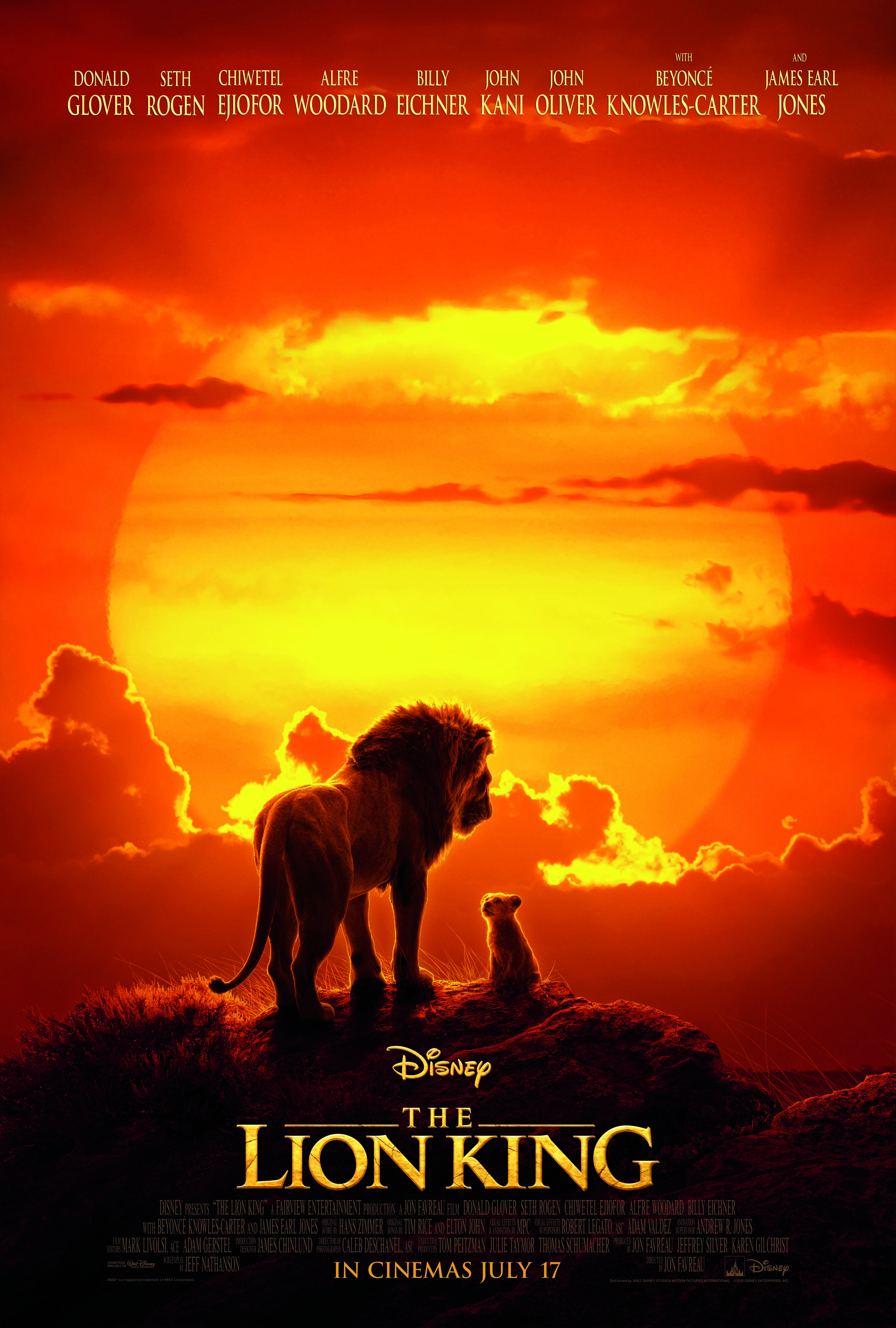 Disney’s “The Lion King”, directed by Jon Favreau, journeys to the African savanna where a future king is born. Simba idolizes his father, King Mufasa, and takes to heart his own royal destiny. But not everyone in the kingdom celebrates the new cub’s arrival. Scar, Mufasa’s brother—and former heir to the throne—has plans of his own. The battle for Pride Rock is ravaged with betrayal, tragedy and drama, ultimately resulting in Simba’s exile. With help from a curious pair of newfound friends, Simba will have to figure out how to grow up and take back what is rightfully his. The all-star cast includes Donald Glover as Simba, Beyoncé Knowles-Carter as Nala, James Earl Jones as Mufasa, Chiwetel Ejiofor as Scar, Seth Rogen as Pumbaa and Billy Eichner as Timon.