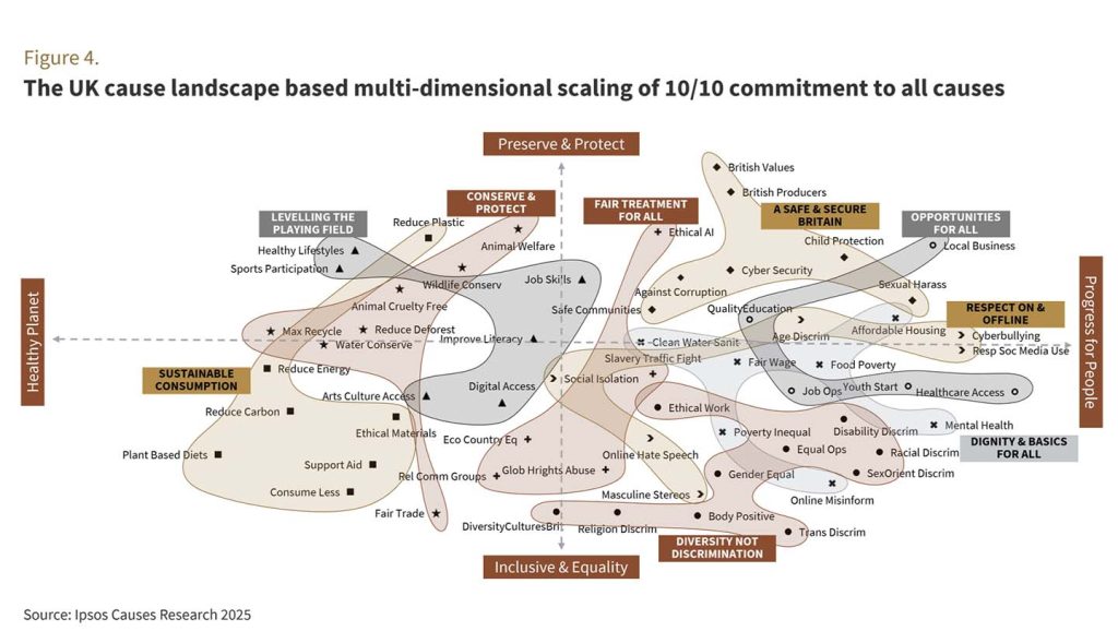 Ipsos’ analysis shows that people do (still) care about causes – 78% of Britons care deeply about at least one. However, it also reveals that the value exchange from brands is less clear-cut. 37% of Britons say they don’t care if brands are “ethical or socially responsible”. And a majority feel that the government, rather than private companies, should act for a cause.