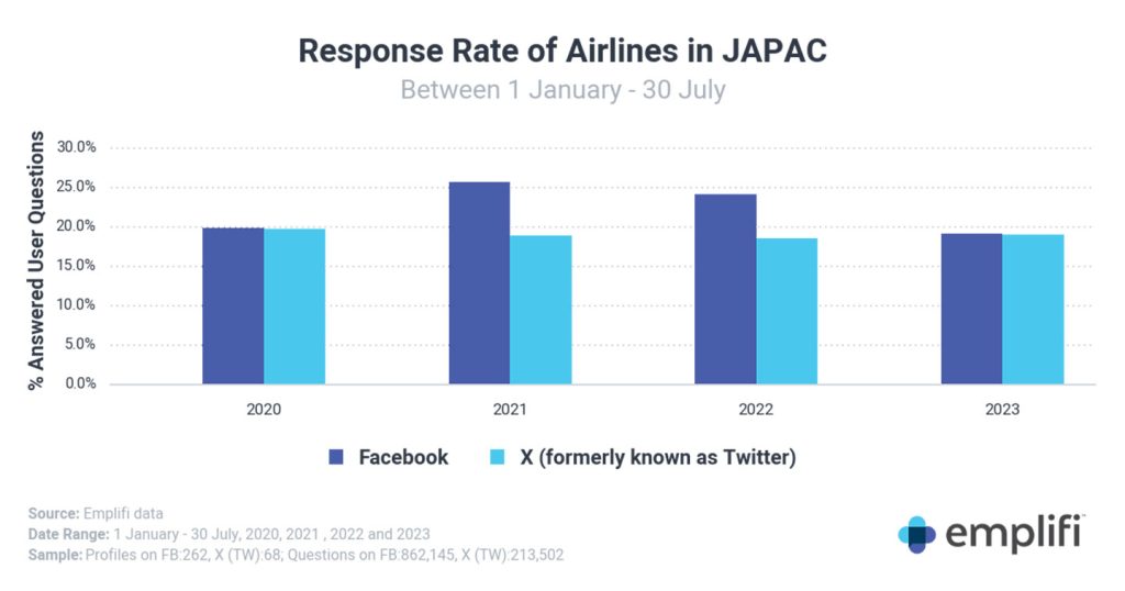 While airlines have implemented social care strategies, there has been limited progress in the post-pandemic era. Following the turbulence of Covid-19, 2021 witnessed global airlines achieving their best response rate to user queries, averaging 23% across platforms (Facebook and X).