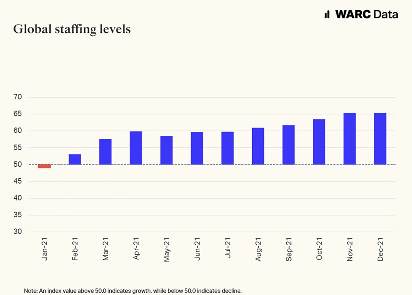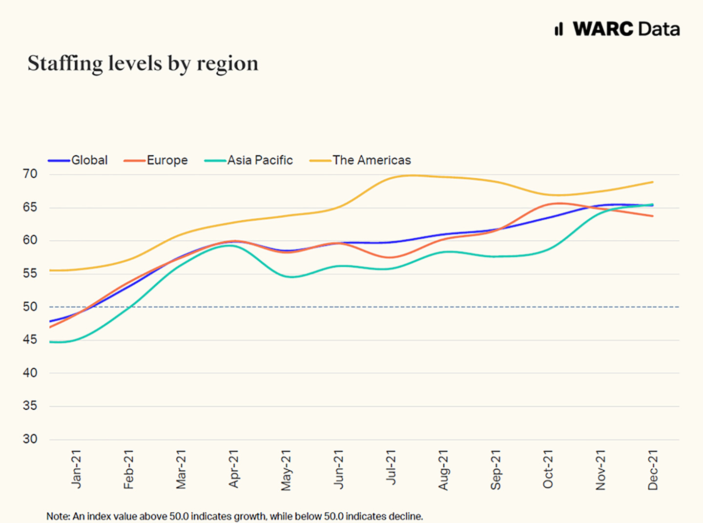 However, the movement is not limited to the Americas as staffing levels in both Europe and APAC have seen an increased rate of growth in Q4. From August onwards, global staffing levels have seen the highest rates of growth since the inception of the Global Marketing Index in 2011, with November and December at 65.3 (the highest index value).
