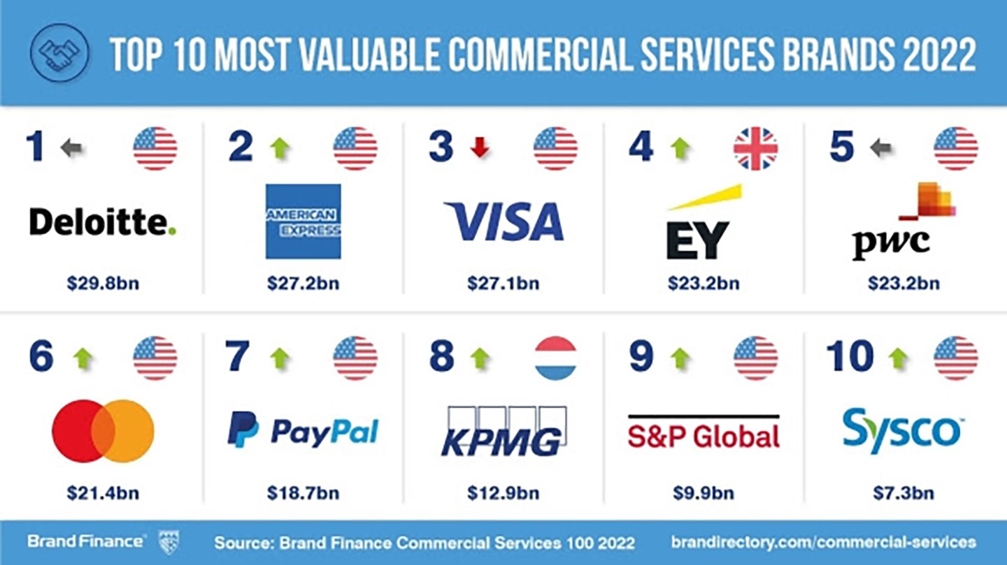 Deloitte (brand value up 12% to US$29.8 billion) sits at the top position in the Commercial Services 100 ranking with a 12% year-on-year brand value growth at US$29.8 billion, but is still below its pre-pandemic value of US$32.4 billion. Despite the impact of the pandemic, in 2021 Deloitte exceeded the US$50 billion revenue mark. Since the outbreak of the pandemic, the demand for consulting services has been disrupted as many brands undertook significant transformation.
