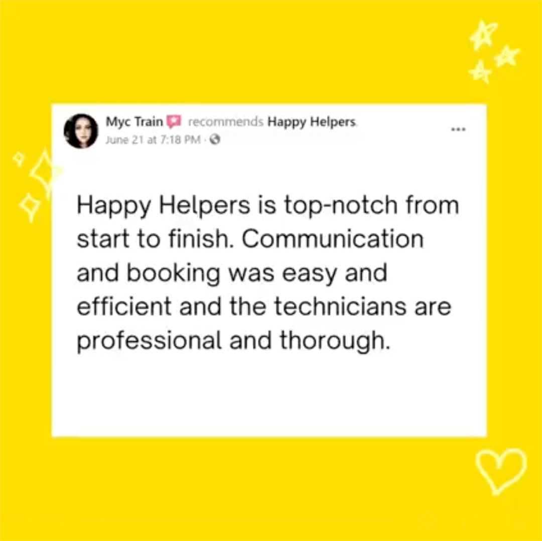 “Our team of Happy Helpers are Reliable, Efficient, Service-oriented and Trustworthy so you can rest easy and have the peace of mind knowing that they will provide the best service possible. Professionally trained to be professionals, our Happy Helpers have their own transportation, bring with them all the tools and equipment required to do the job, and possess the proper skillset, mindset and heartset to satisfy our clients’ needs.”