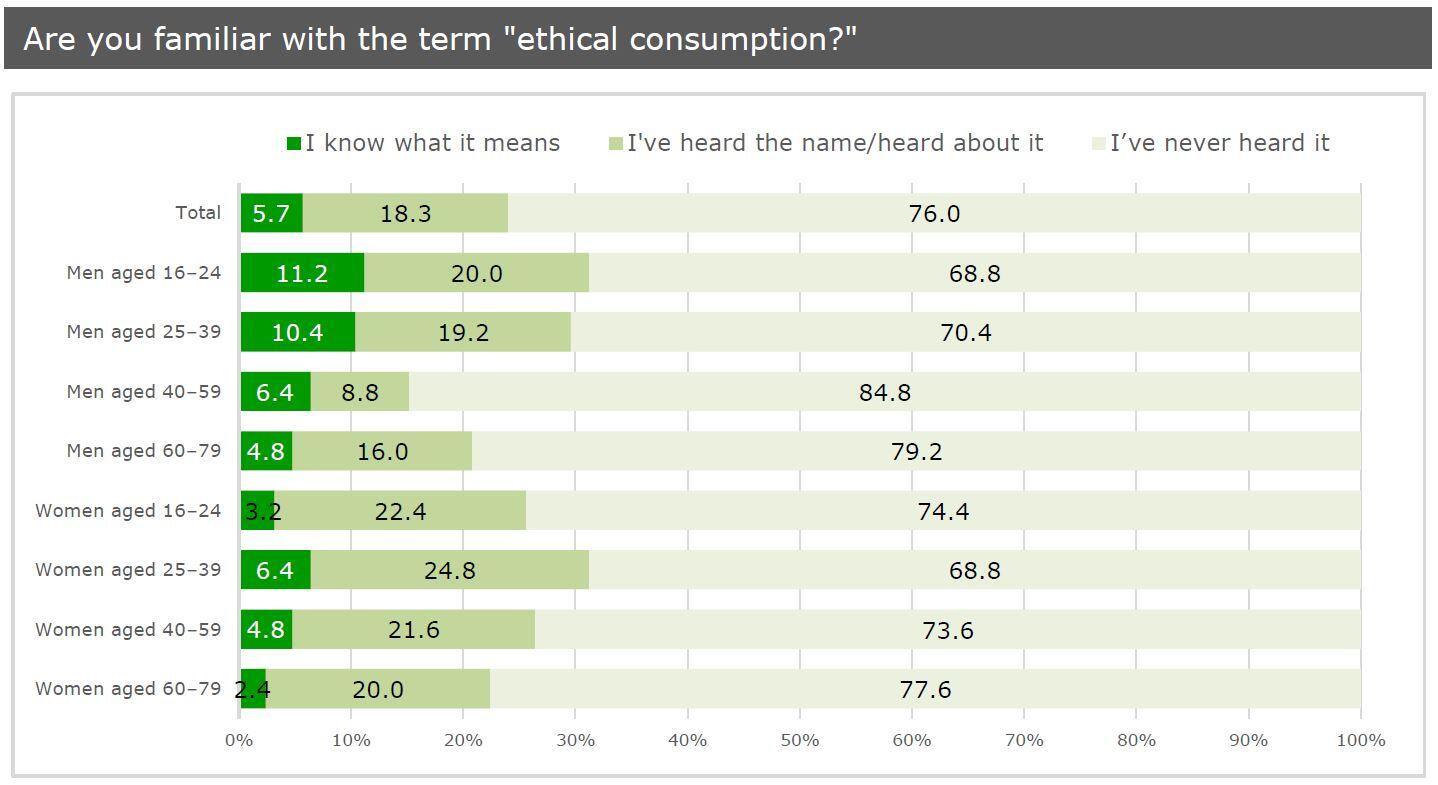 “Ethical consumption” has a recognition rate of 24.0%. Of those individuals, 5.7% answered “I know what it means” and 18.3% answered “I’ve heard about it.” Recognition was relatively high among Millennial and Generation Z men and women. Men aged 16-24 and women aged 25-39 have the highest recognition rates, and men aged 40-59 the lowest recognition rate.
