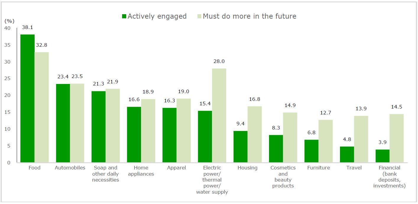 Respondents appeared to be under the strong impression that ethical efforts were already being made in the food (38.1%), automobile (23.4%), and daily necessity (21.3%) industries. At the same time, there is shown to be a large gap between current awareness and expected value, with high expectations for upcoming efforts in the energy (electric power/thermal power/water supply), financial, and travel industries.