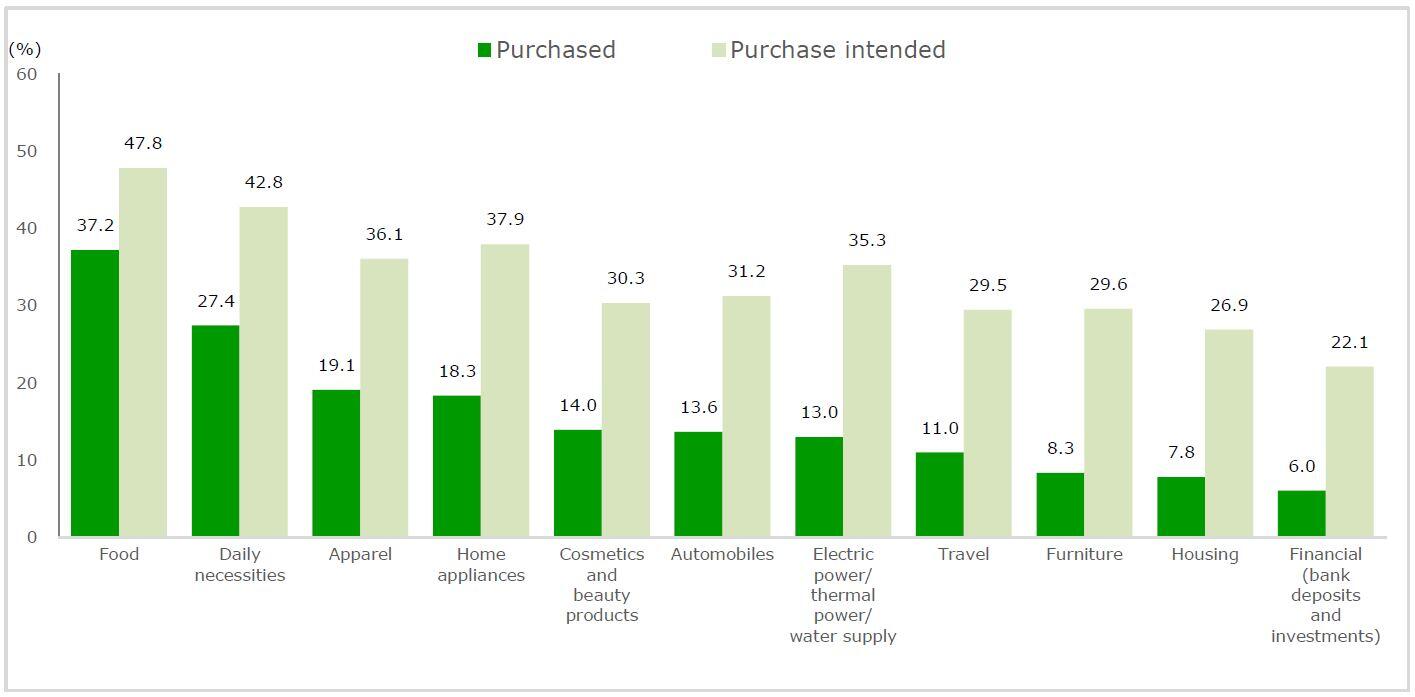The food, automobile, and daily necessity industries experience the most purchases, while the food, automobiles and home appliance industries account for the greatest intention to purchase. There are also large gaps between actual purchase experience and purchase intention, with high expectations for the future in the electricity/thermal power/water supply (22.3 percentage points), furniture (21.2 percentage points), and home appliances (19.6 percentage points) industries.