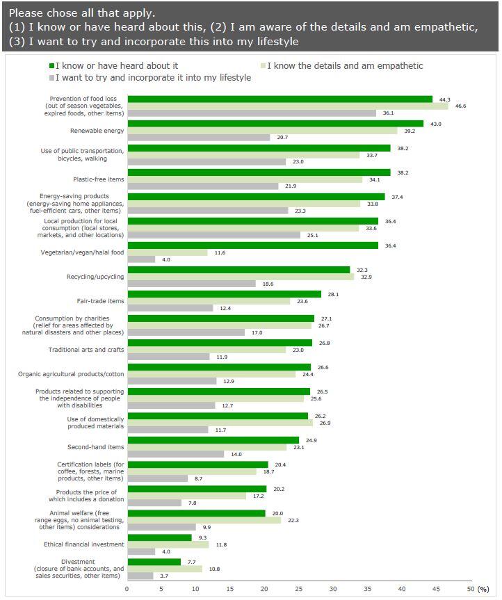 Among 20 initiatives related to ethical consumption, the top ranked in terms of awareness, empathy, and intention to engage include awareness of “food loss prevention” (44.3%) and “renewable energy” (43.0%); empathy with “food loss prevention” (46.6%) and “renewable energy” (39.2%); and intention to engage in “food loss prevention” (36.1%) and “local production for local consumption” (25.1%).