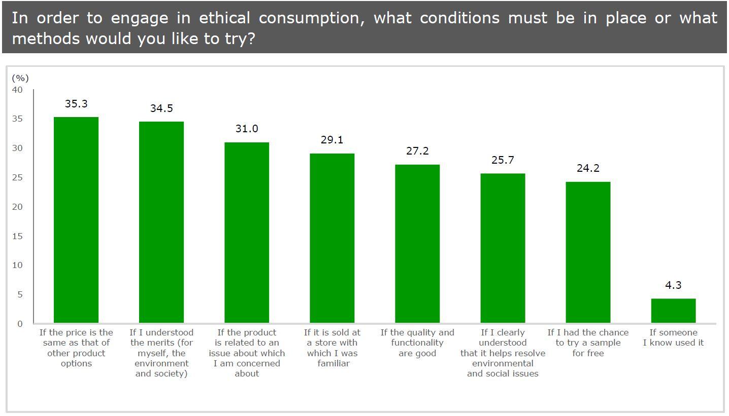 The main conditions respondents said must be met for them to buy an item include “if the price is the same as that of other product options” (35.3%), “if I understand the merits” (34.5%), “if the product is related to an issue I was concerned about” (31.0%), and “if it is sold at a store with which I am familiar” (29.1%).