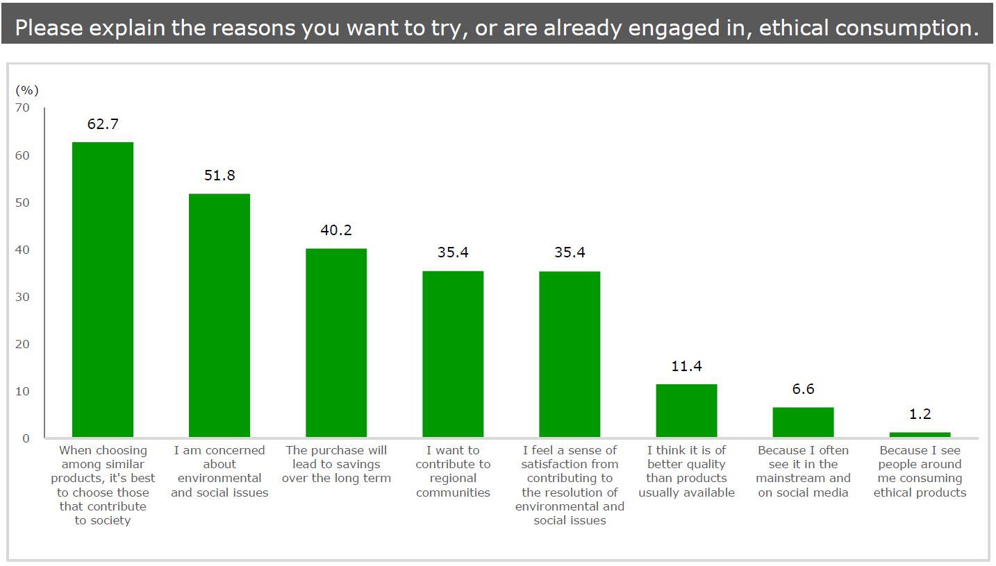(1) More than 50% of respondents believe that “the provision of ethical products and services will improve a company’s image.” One in four is familiar with the term “ethical consumption.”