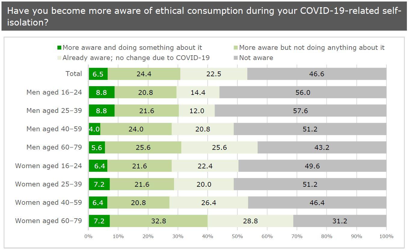 Some 30.9% of respondents said their ethical consumption “awareness increased” during COVID-19 self-isolation. At the same time, only 6.5% did something about it.
